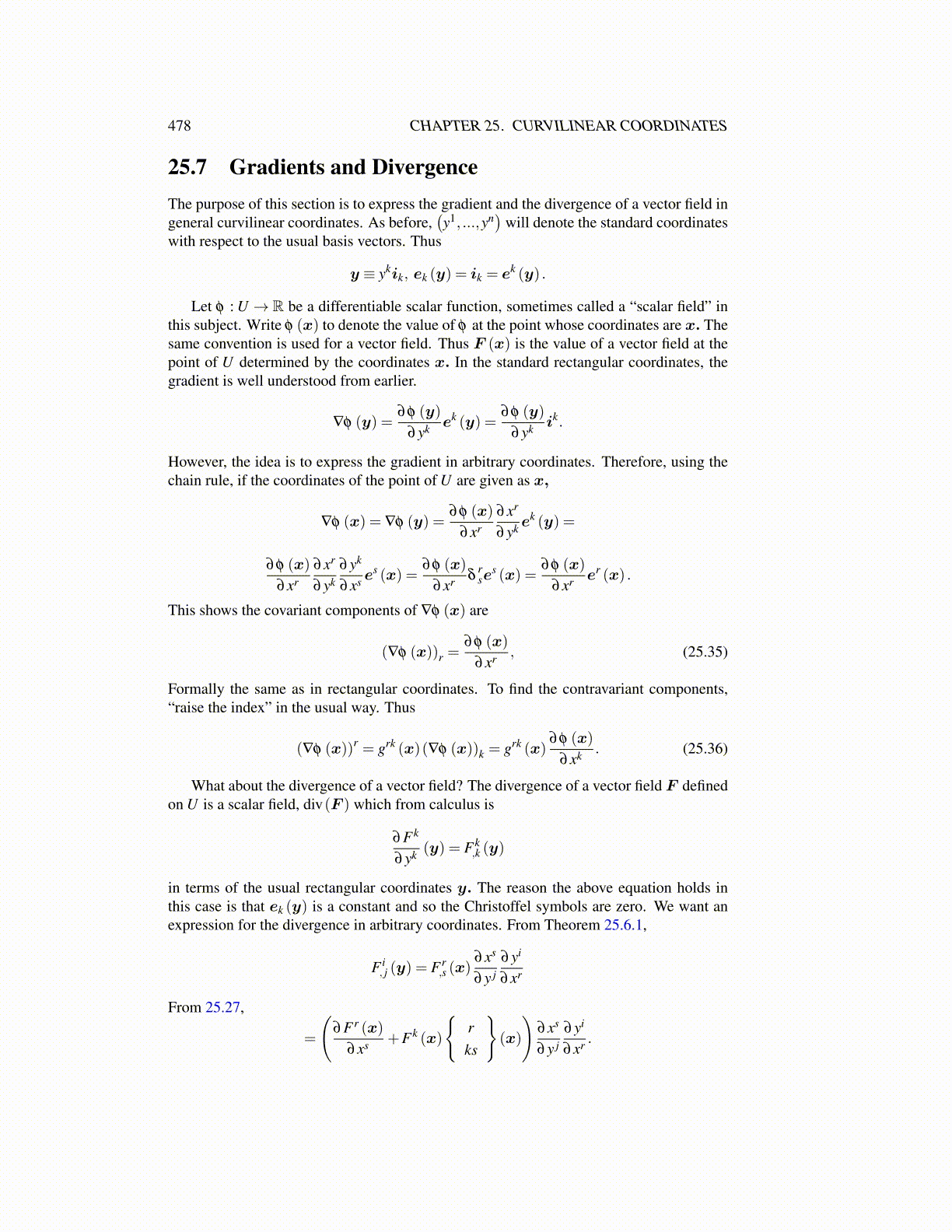 in terms of the usual rectangular coordinates y. The reason the above equation holds inthis case is that ek (y) is a constant and so the Christoffel symbols are zero. We want anexpression for the divergence in arbitrary coordinates. From Theorem 25.6.1,