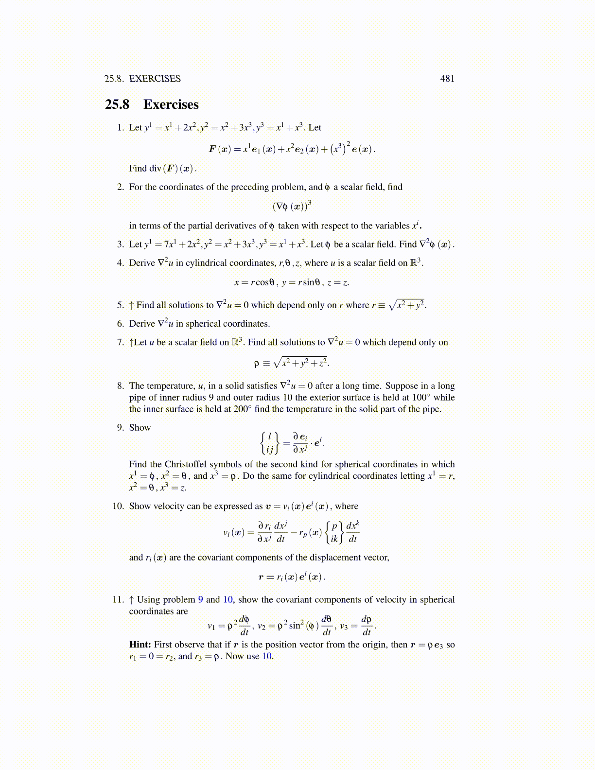 Find the Christoffel symbols of the second kind for spherical coordinates in whichx1 = φ , x2 = θ , and x3 = ρ. Do the same for cylindrical coordinates letting x1 = r,x2 = θ , x3 = z.