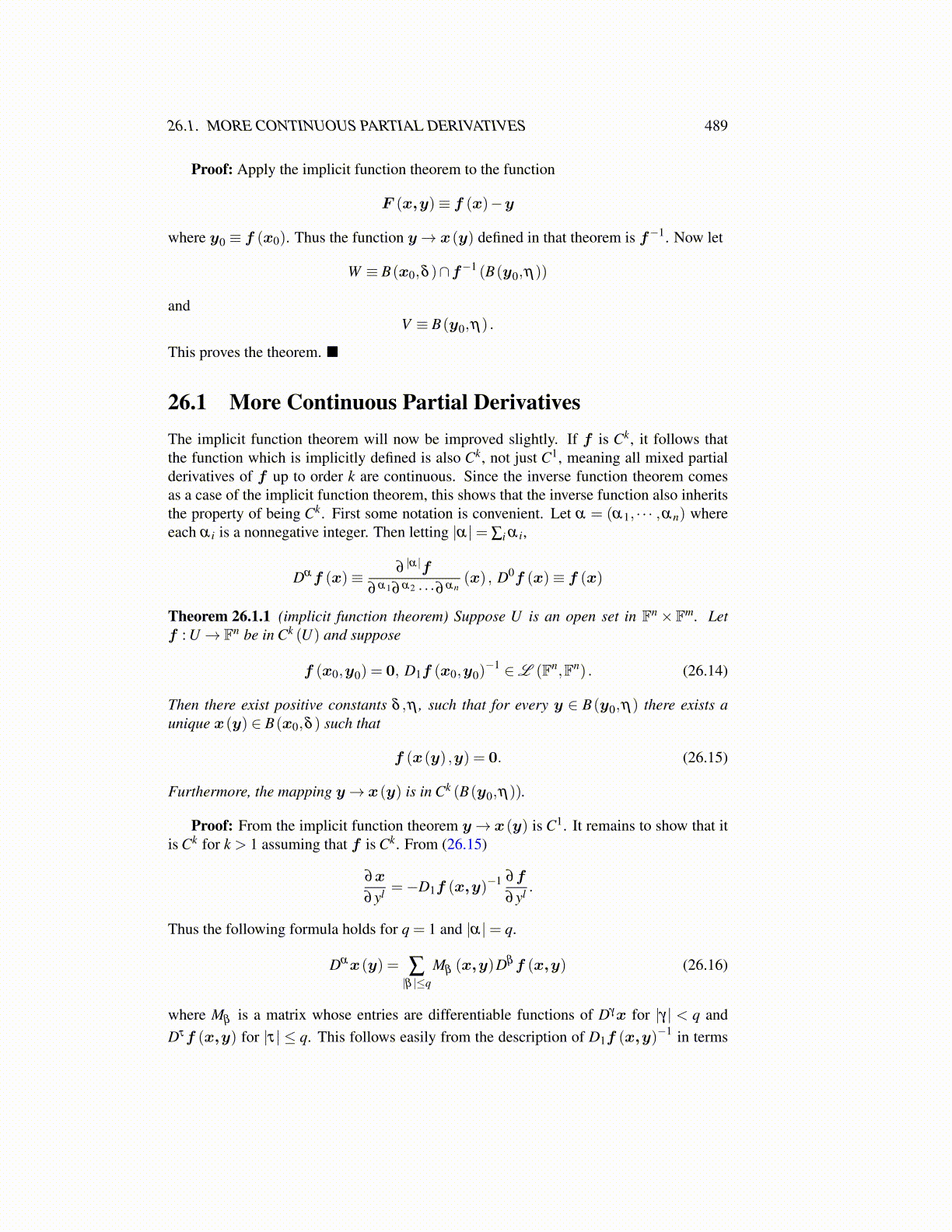 26.1 More Continuous Partial DerivativesThe implicit function theorem will now be improved slightly. If f is Ck, it follows thatthe function which is implicitly defined is also Ck, not just C1, meaning all mixed partialderivatives of f up to order k are continuous. Since the inverse function theorem comesas a case of the implicit function theorem, this shows that the inverse function also inheritsthe property of being Ck. First some notation is convenient. Let α = (α1, · · · ,αn) whereeach α i is a nonnegative integer. Then letting |α|= ∑i α i,