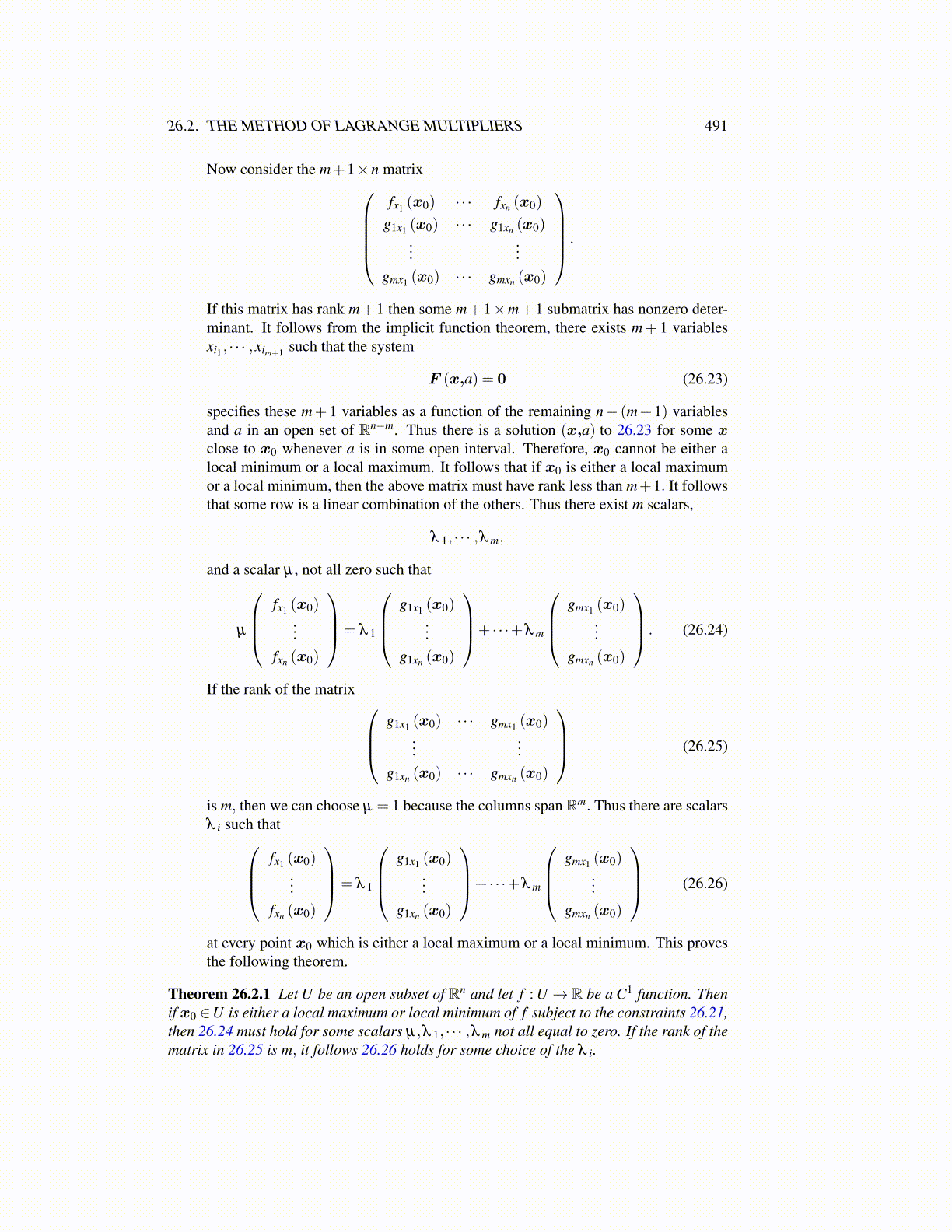Theorem 26.2.1 Let U be an open subset of Rn and let f : U → R be a C1 function. Thenif x0 ∈U is either a local maximum or local minimum of f subject to the constraints 26.21,then 26.24 must hold for some scalars µ,λ 1, · · · ,λ m not all equal to zero. If the rank of thematrix in 26.25 is m, it follows 26.26 holds for some choice of the λ i.
