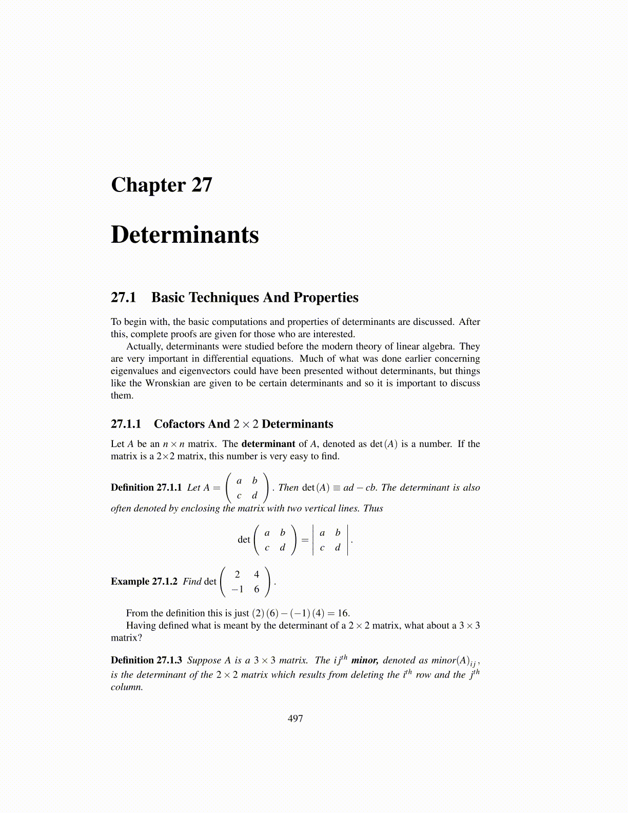 27.1 Basic Techniques And PropertiesTo begin with, the basic computations and properties of determinants are discussed. Afterthis, complete proofs are given for those who are interested.
