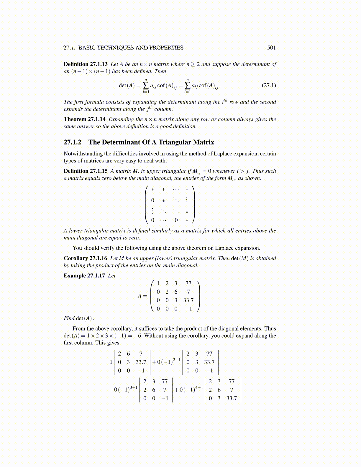 27.1.2 The Determinant Of A Triangular MatrixNotwithstanding the difficulties involved in using the method of Laplace expansion, certaintypes of matrices are very easy to deal with.