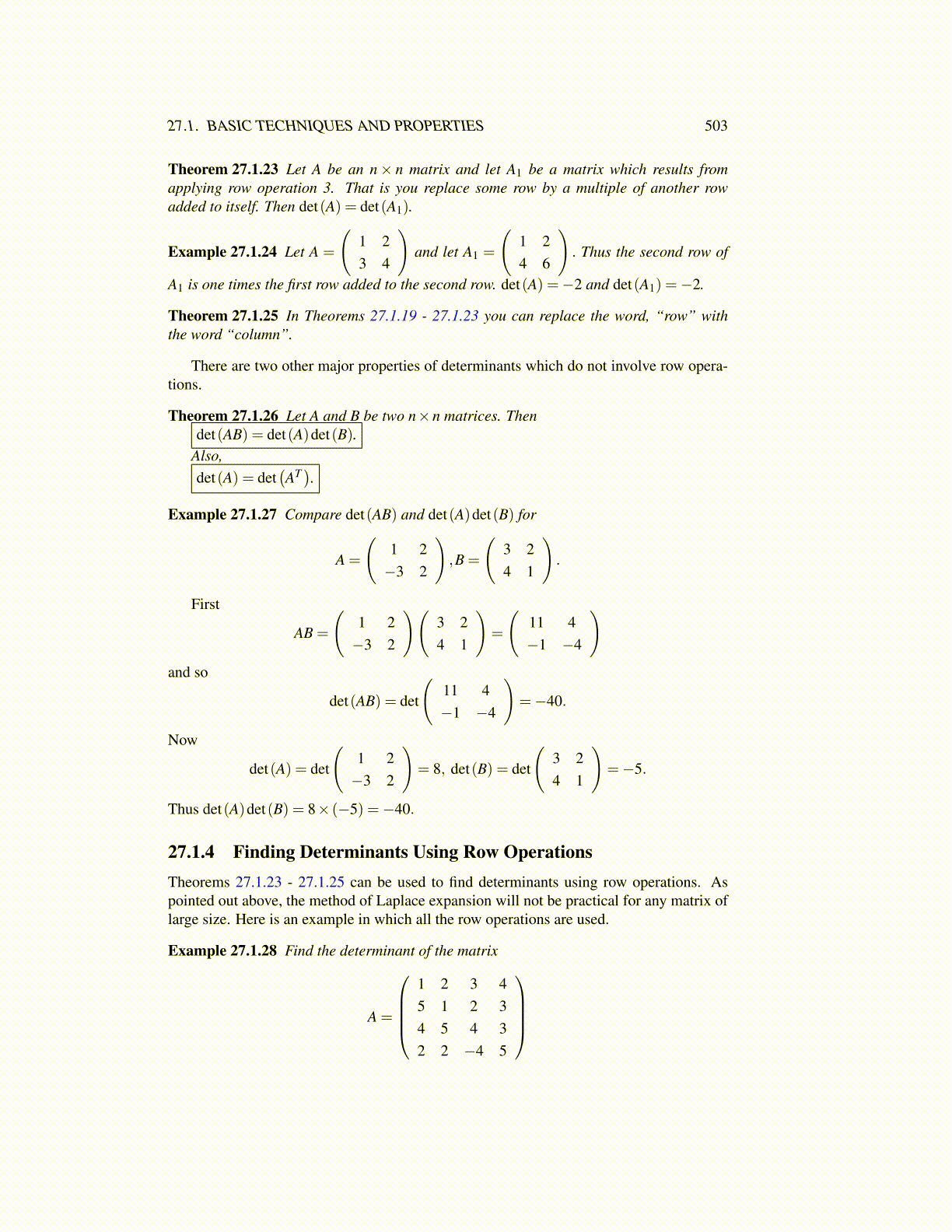 27.1.4 Finding Determinants Using Row OperationsTheorems 27.1.23 - 27.1.25 can be used to find determinants using row operations. Aspointed out above, the method of Laplace expansion will not be practical for any matrix oflarge size. Here is an example in which all the row operations are used.