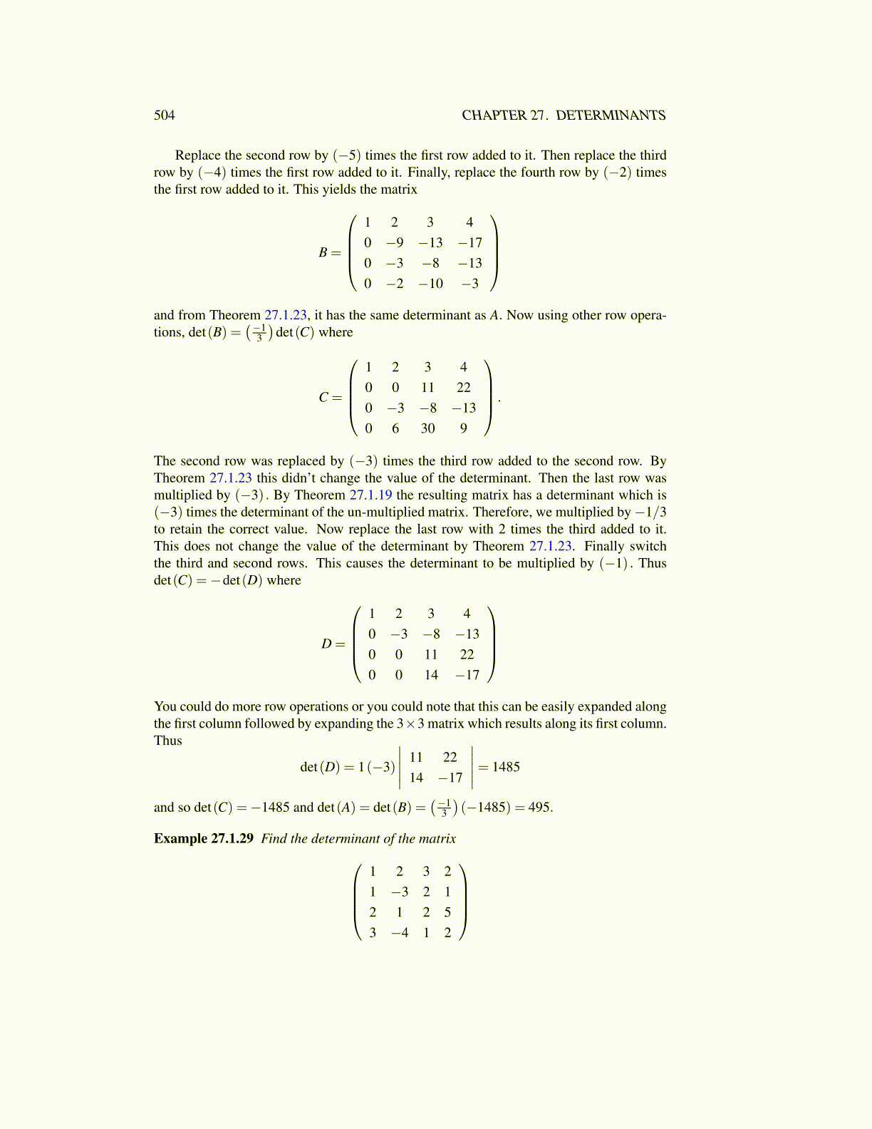 The second row was replaced by (−3) times the third row added to the second row. ByTheorem 27.1.23 this didn’t change the value of the determinant. Then the last row wasmultiplied by (−3) . By Theorem 27.1.19 the resulting matrix has a determinant which is(−3) times the determinant of the un-multiplied matrix. Therefore, we multiplied by−1/3to retain the correct value. Now replace the last row with 2 times the third added to it.This does not change the value of the determinant by Theorem 27.1.23. Finally switchthe third and second rows. This causes the determinant to be multiplied by (−1) . Thusdet(C) =−det(D) where