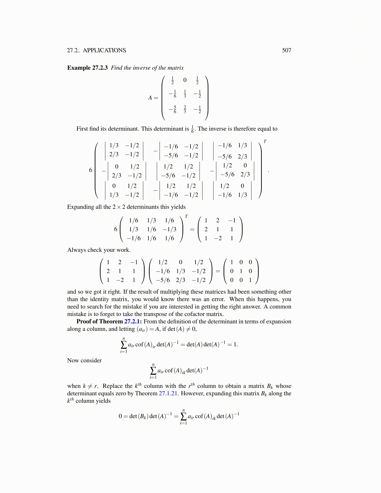 Proof of Theorem 27.2.1: From the definition of the determinant in terms of expansionalong a column, and letting (air) = A, if det(A) ̸= 0,