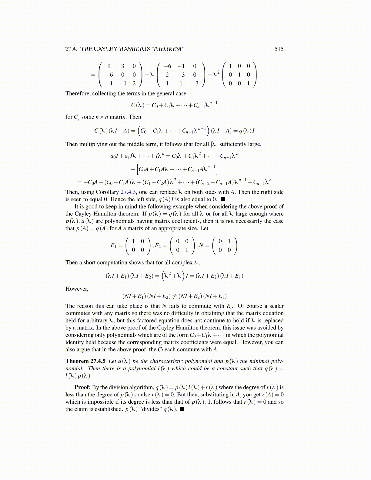The reason this can take place is that N fails to commute with Ei. Of course a scalarcommutes with any matrix so there was no difficulty in obtaining that the matrix equationheld for arbitrary λ , but this factored equation does not continue to hold if λ is replacedby a matrix. In the above proof of the Cayley Hamilton theorem, this issue was avoided byconsidering only polynomials which are of the form C0+C1λ + · · · in which the polynomialidentity held because the corresponding matrix coefficients were equal. However, you canalso argue that in the above proof, the Ci each commute with A.