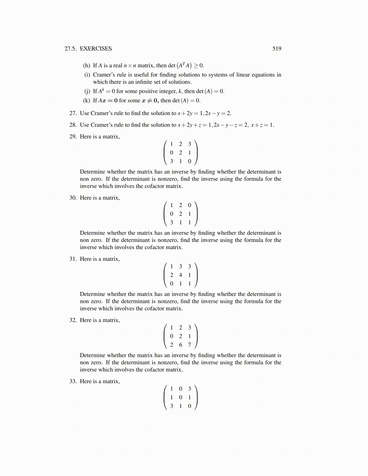 (k) If Ax= 0 for some x ̸= 0, then det(A) = 0.