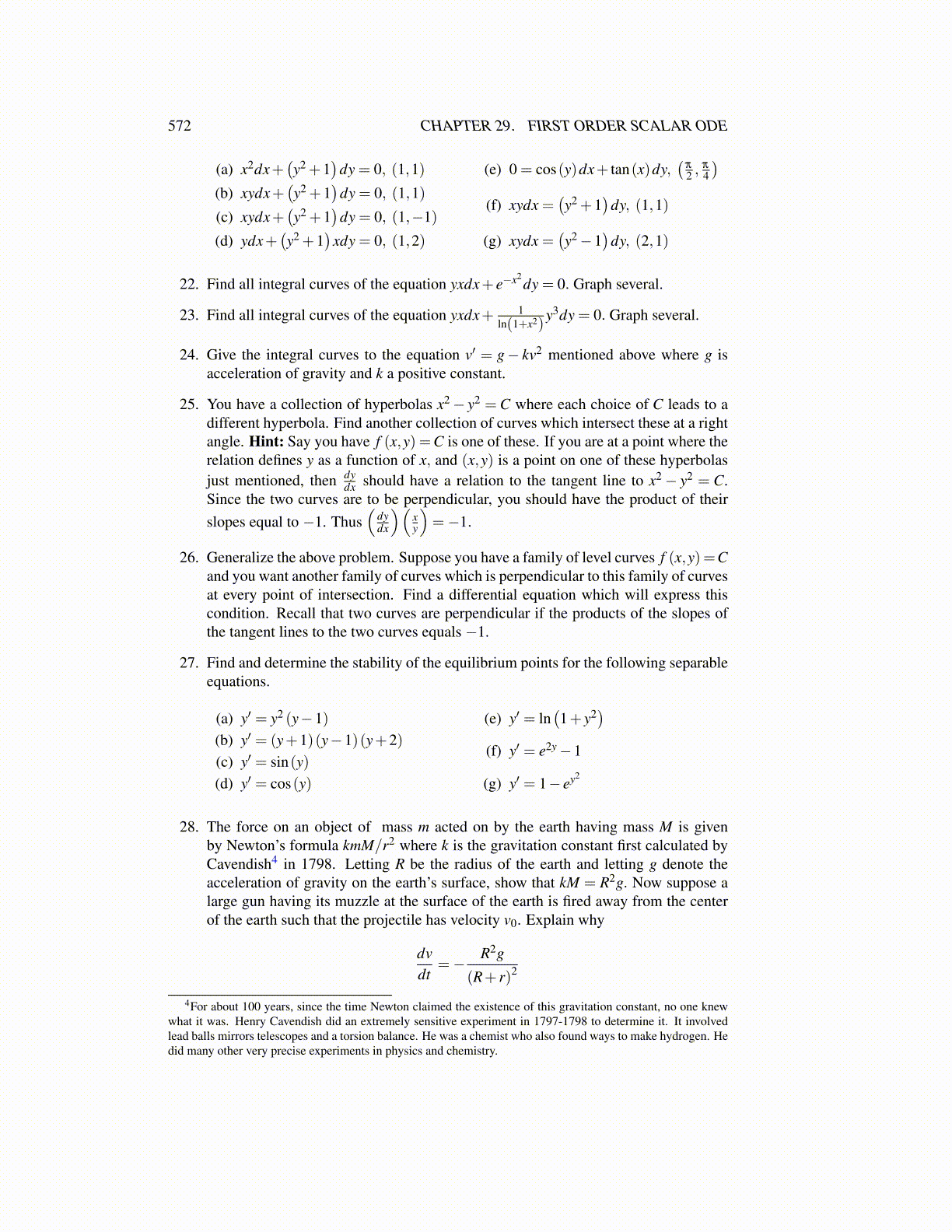 28. The force on an object of mass m acted on by the earth having mass M is givenby Newton’s formula kmM/r2 where k is the gravitation constant first calculated byCavendish4 in 1798. Letting R be the radius of the earth and letting g denote theacceleration of gravity on the earth’s surface, show that kM = R2g. Now suppose alarge gun having its muzzle at the surface of the earth is fired away from the centerof the earth such that the projectile has velocity v0. Explain why