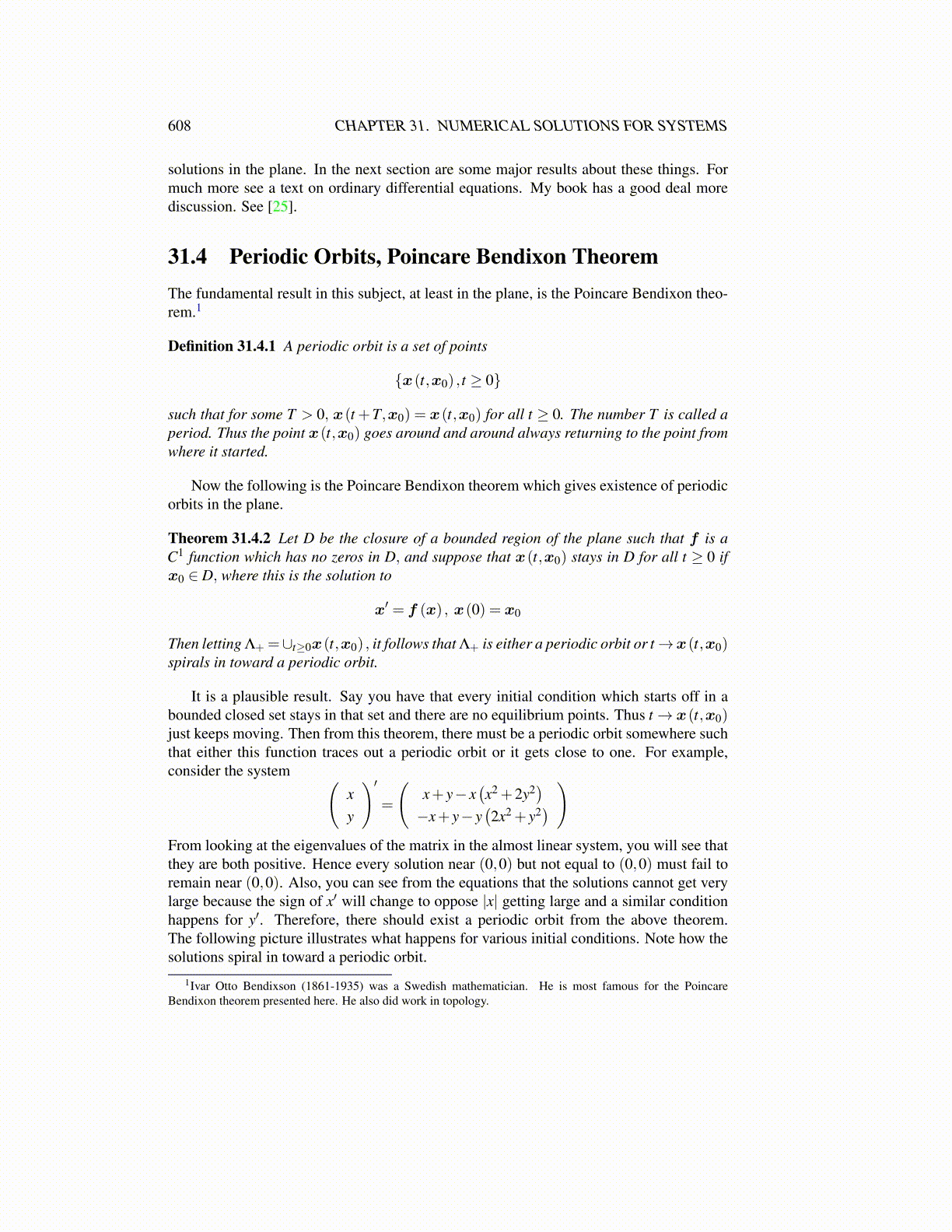 31.4 Periodic Orbits, Poincare Bendixon TheoremThe fundamental result in this subject, at least in the plane, is the Poincare Bendixon theo-rem.1