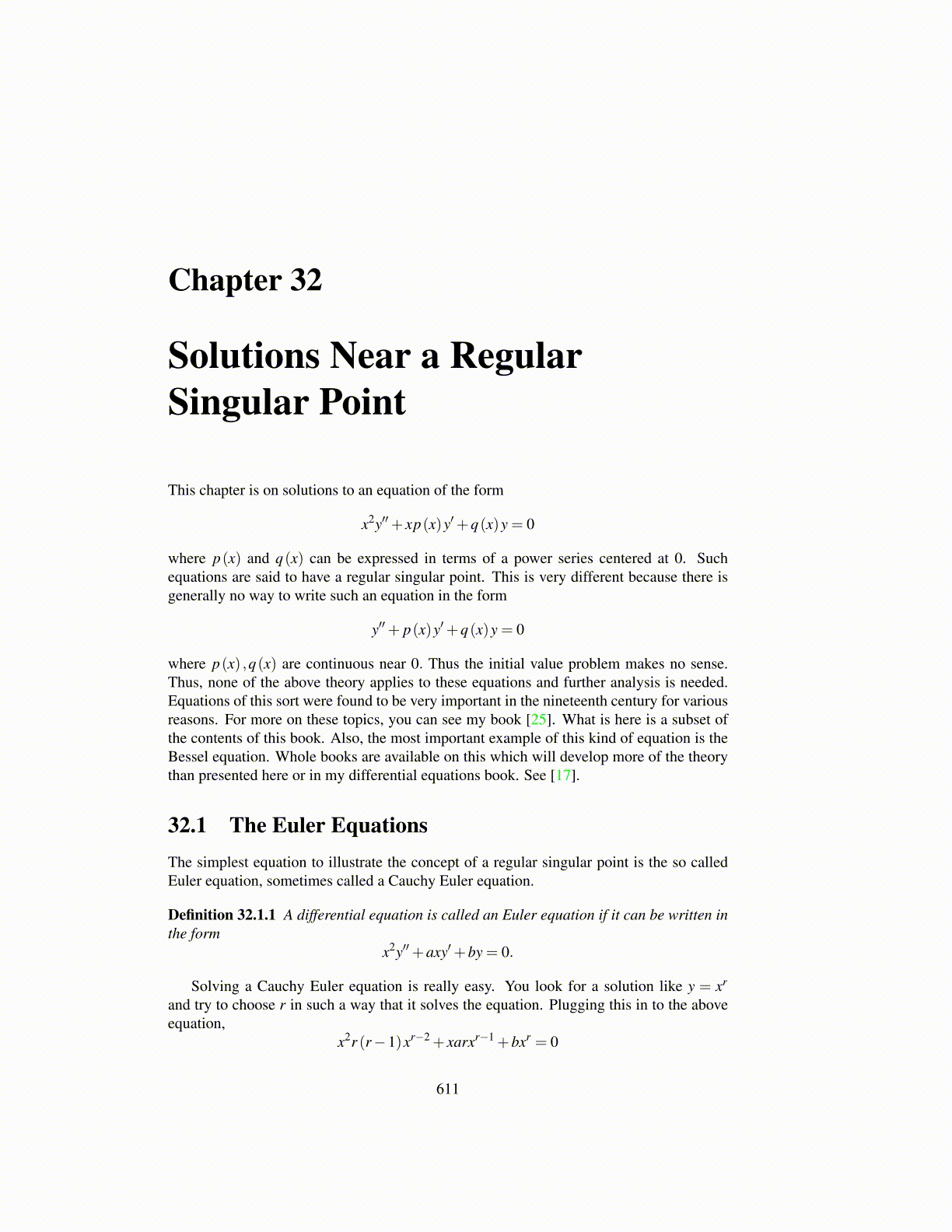 32.1 The Euler EquationsThe simplest equation to illustrate the concept of a regular singular point is the so calledEuler equation, sometimes called a Cauchy Euler equation.
