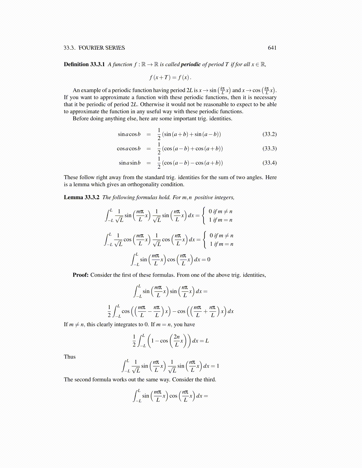 Definition 33.3.1 A function f : R→ R is called periodic of period T if for all x ∈ R,