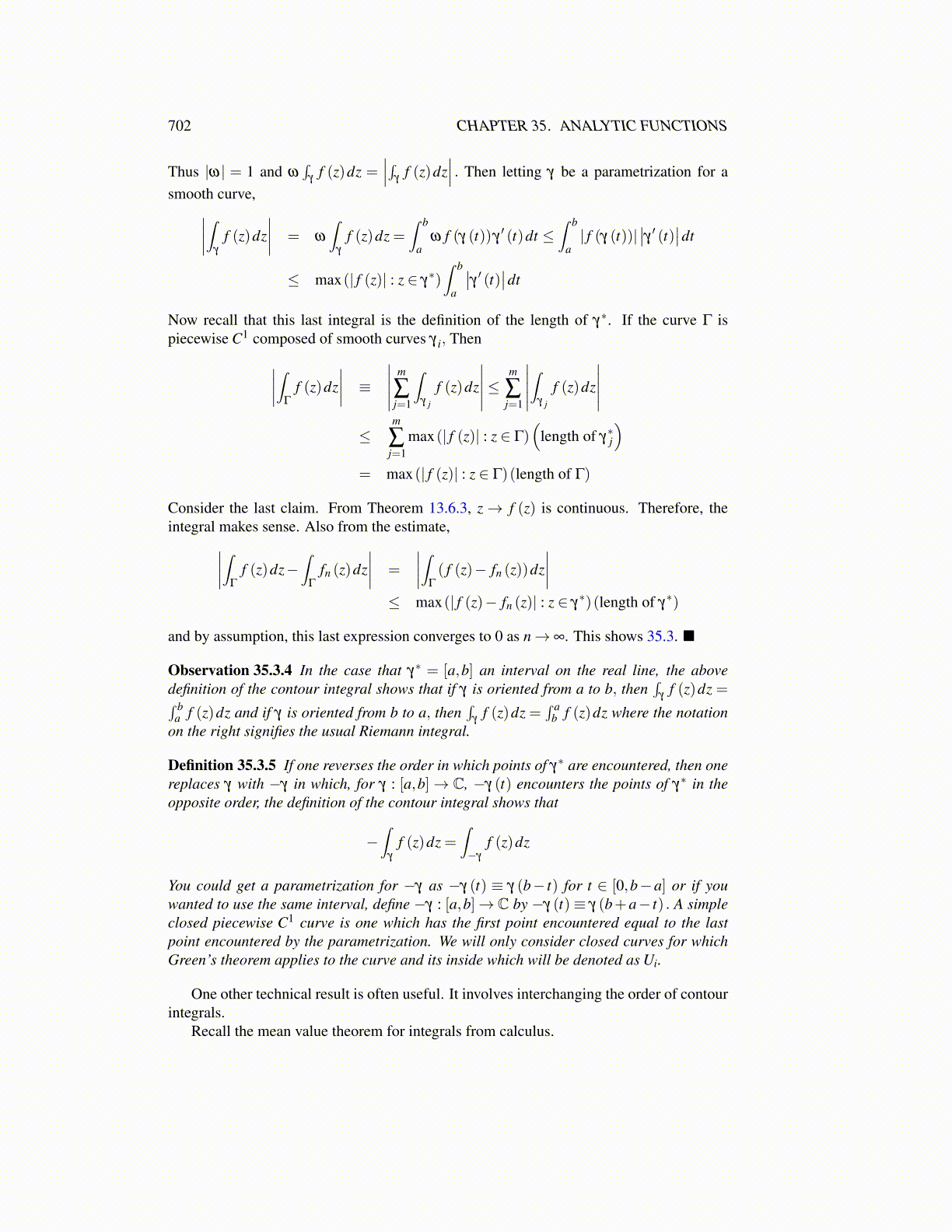 Consider the last claim. From Theorem 13.6.3, z→ f (z) is continuous. Therefore, theintegral makes sense. Also from the estimate,∣∣∣∣∫