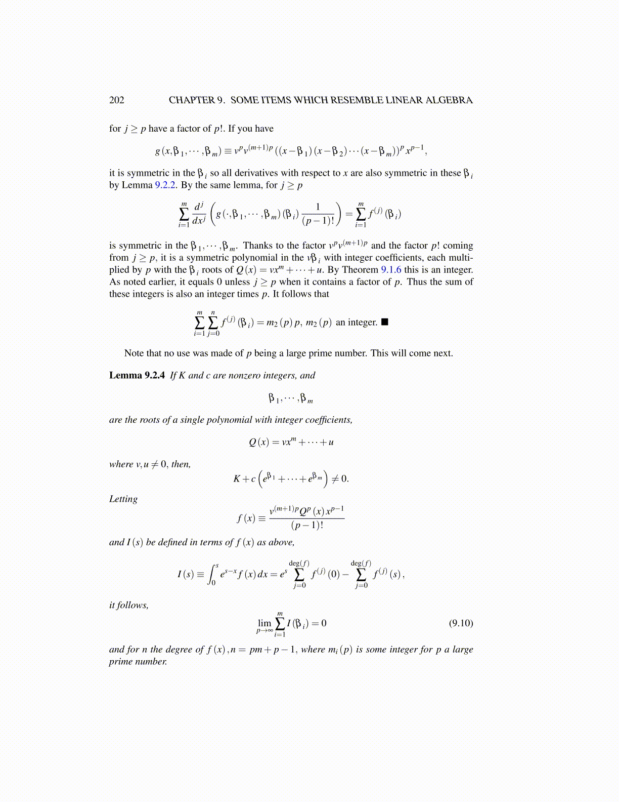is symmetric in the β 1, · · · ,β m. Thanks to the factor vpv(m+1)p and the factor p! comingfrom j ≥ p, it is a symmetric polynomial in the vβ i with integer coefficients, each multi-plied by p with the β i roots of Q(x) = vxm + · · ·+ u. By Theorem 9.1.6 this is an integer.As noted earlier, it equals 0 unless j ≥ p when it contains a factor of p. Thus the sum ofthese integers is also an integer times p. It follows that