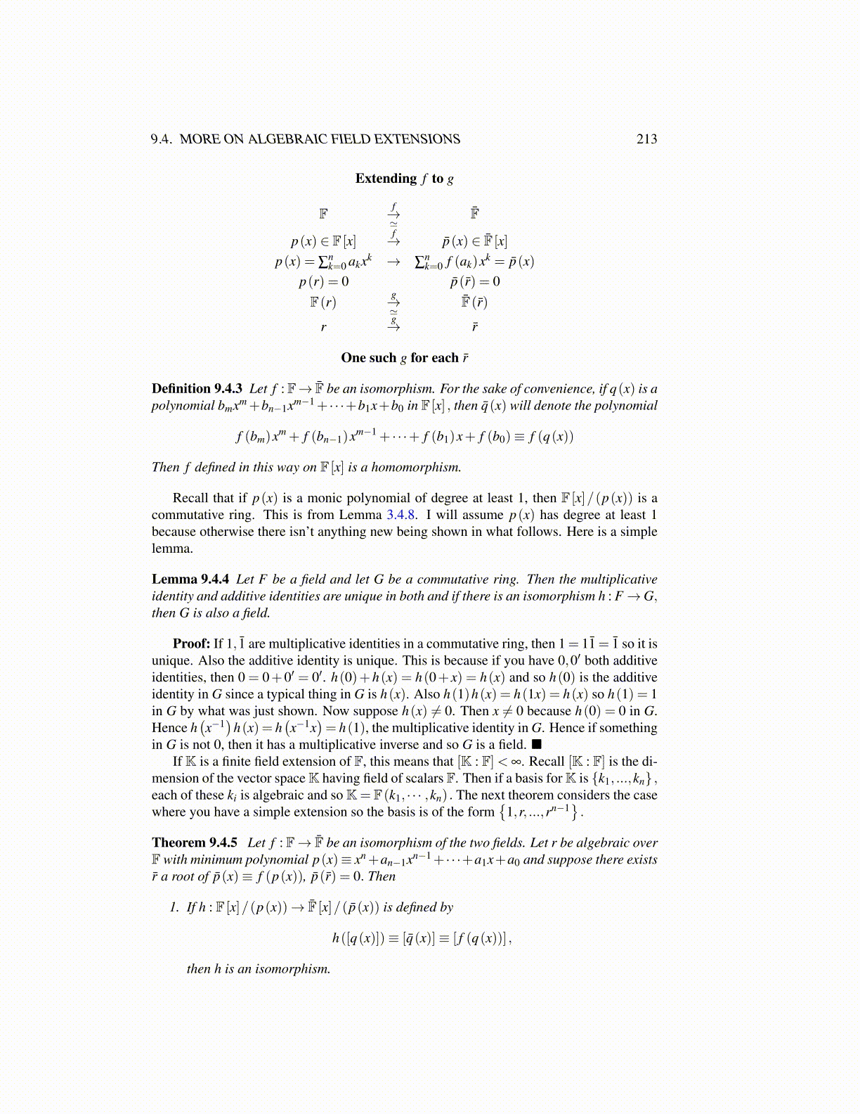 Theorem 9.4.5 Let f : F→ F̄ be an isomorphism of the two fields. Let r be algebraic overF with minimum polynomial p(x)≡ xn+an−1xn−1+ · · ·+a1x+a0 and suppose there existsr̄ a root of p̄(x)≡ f (p(x)), p̄(r̄) = 0. Then