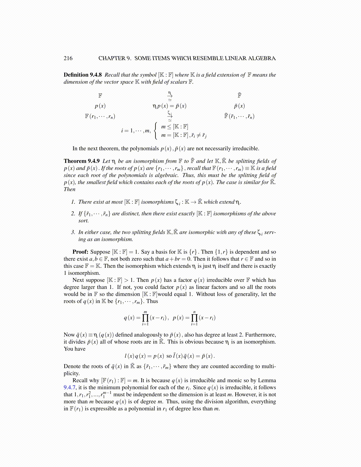 Theorem 9.4.9 Let η be an isomorphism from F to F̄ and let K,K̄ be splitting fields ofp(x) and p̄(x) . If the roots of p(x) are {r1, · · · ,rm} , recall that F(r1, · · · ,rm)≡K is a fieldsince each root of the polynomials is algebraic. Thus, this must be the splitting field ofp(x), the smallest field which contains each of the roots of p(x). The case is similar for K̄.Then