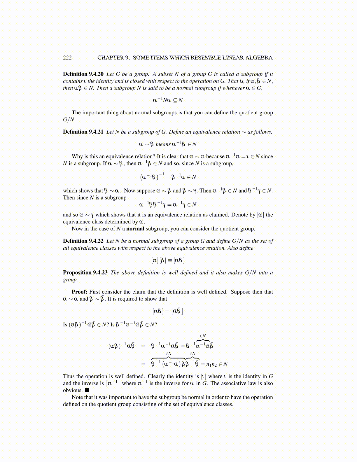Definition 9.4.22 Let N be a normal subgroup of a group G and define G/N as the set ofall equivalence classes with respect to the above equivalence relation. Also define