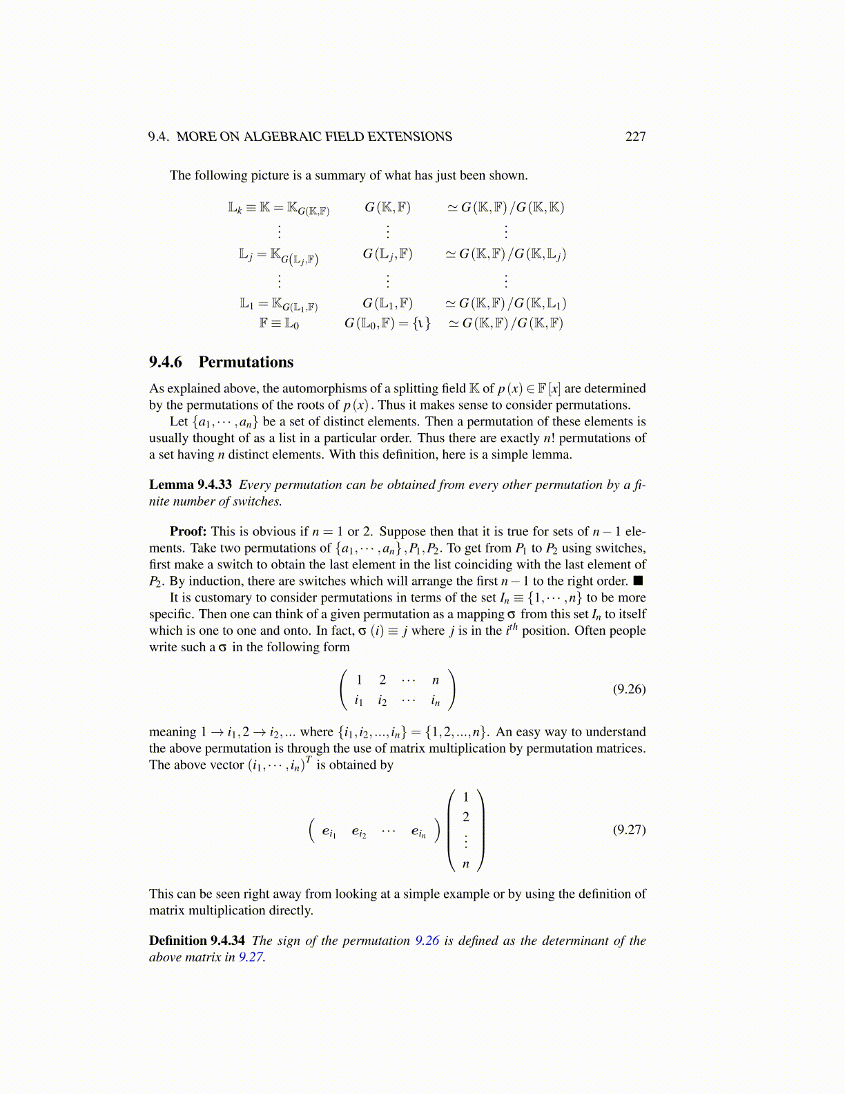 Definition 9.4.34 The sign of the permutation 9.26 is defined as the determinant of theabove matrix in 9.27.