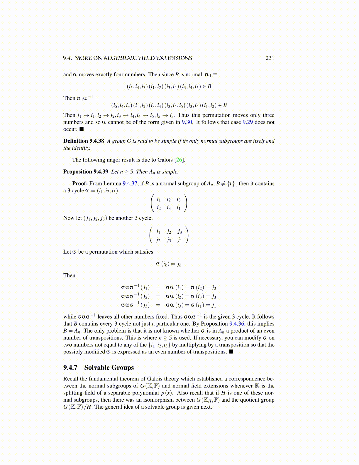 Proof: From Lemma 9.4.37, if B is a normal subgroup of An, B ̸= {ι} , then it containsa 3 cycle α = (i1, i2, i3), (