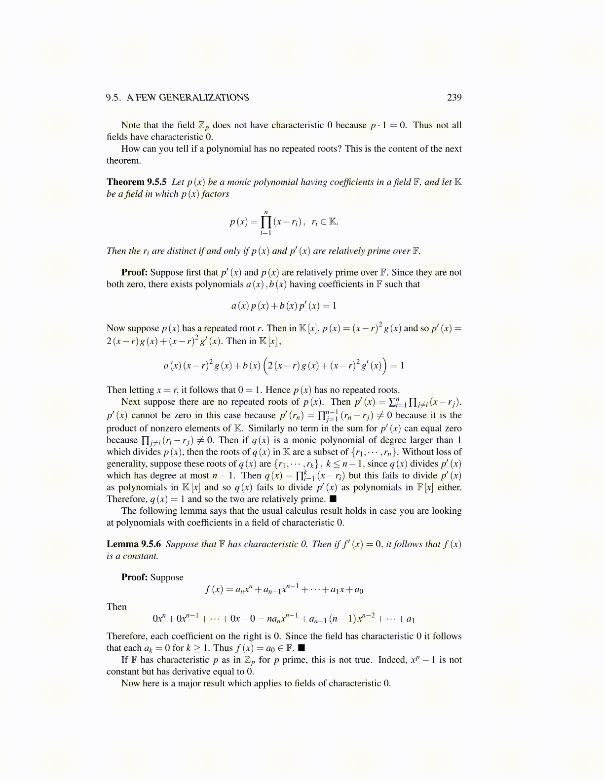 Lemma 9.5.6 Suppose that F has characteristic 0. Then if f ′ (x) = 0, it follows that f (x)is a constant.