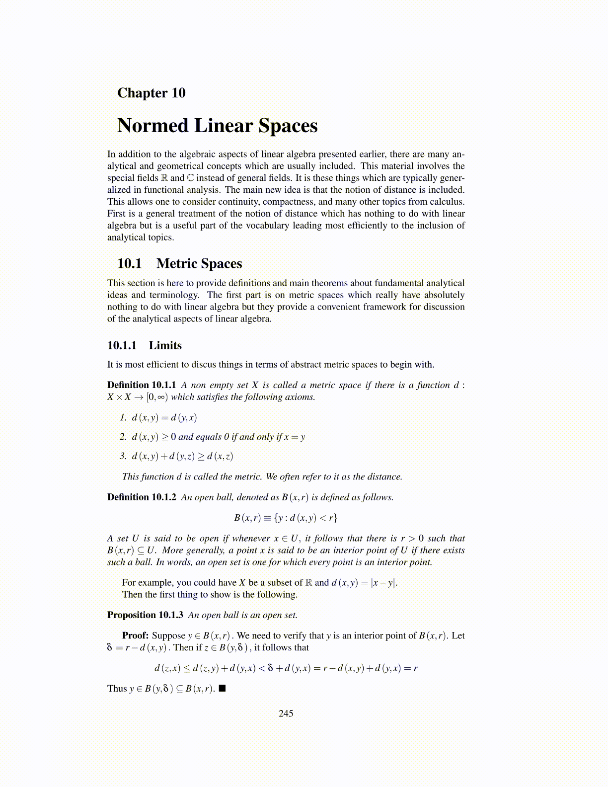 10.1 Metric SpacesThis section is here to provide definitions and main theorems about fundamental analyticalideas and terminology. The first part is on metric spaces which really have absolutelynothing to do with linear algebra but they provide a convenient framework for discussionof the analytical aspects of linear algebra.