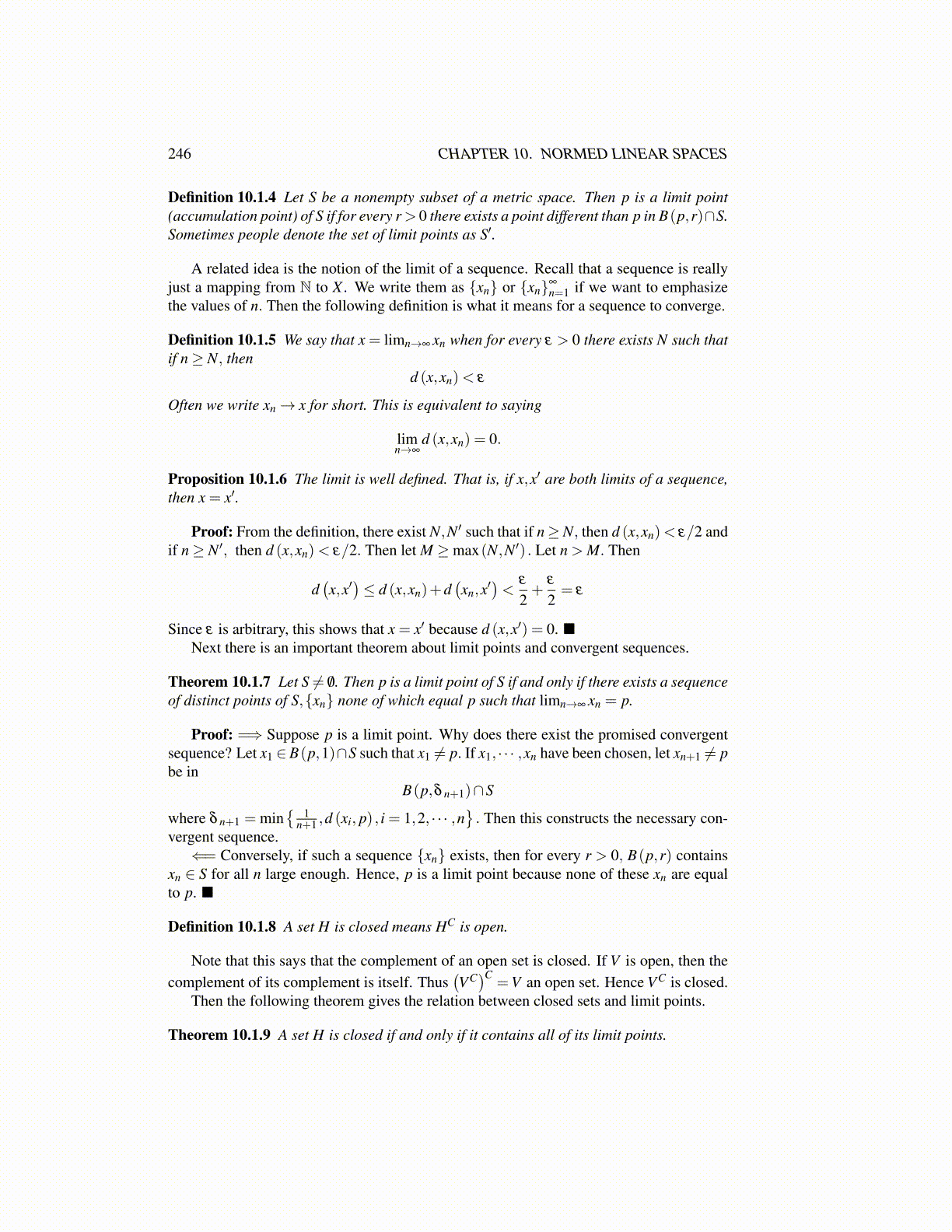 Theorem 10.1.9 A set H is closed if and only if it contains all of its limit points.