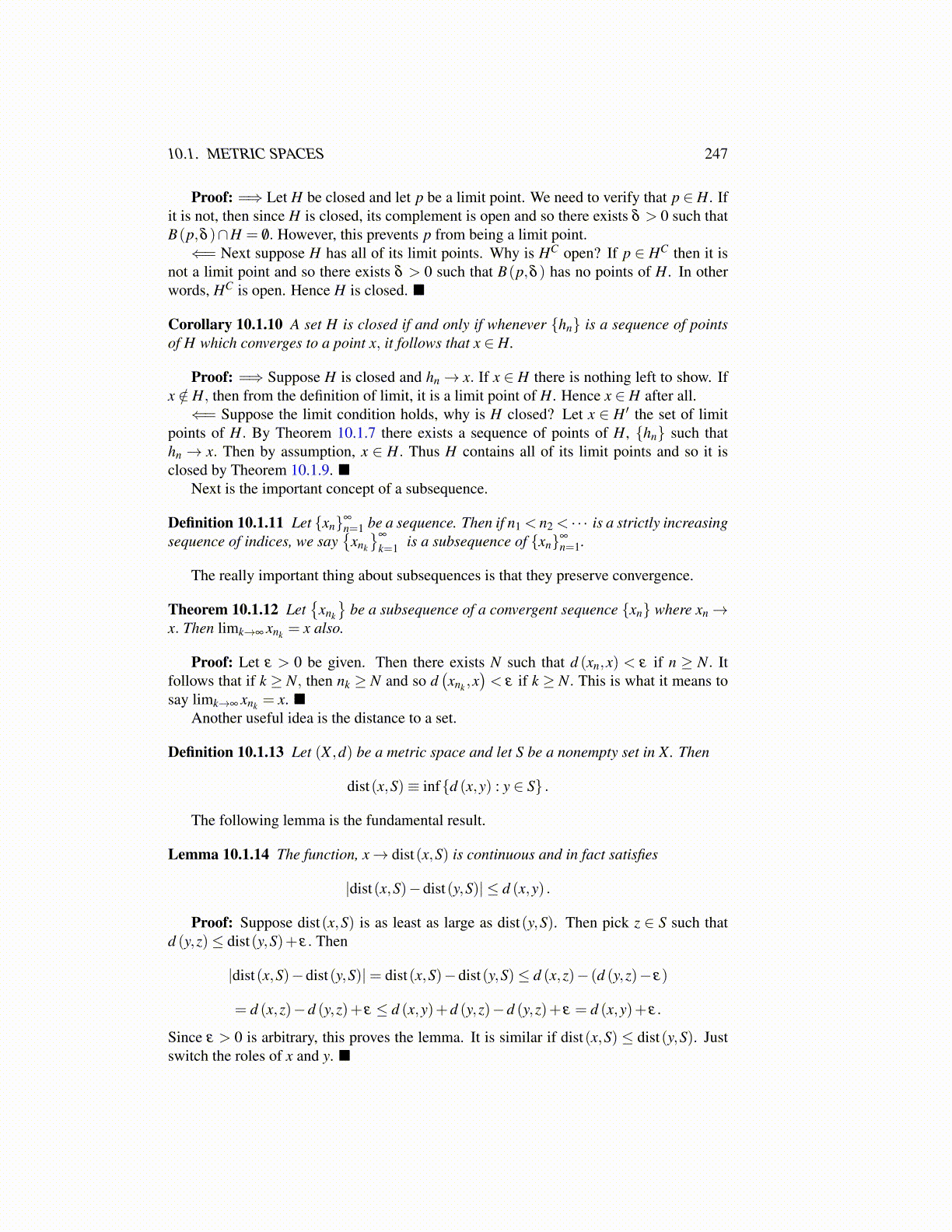 Corollary 10.1.10 A set H is closed if and only if whenever {hn} is a sequence of pointsof H which converges to a point x, it follows that x ∈ H.