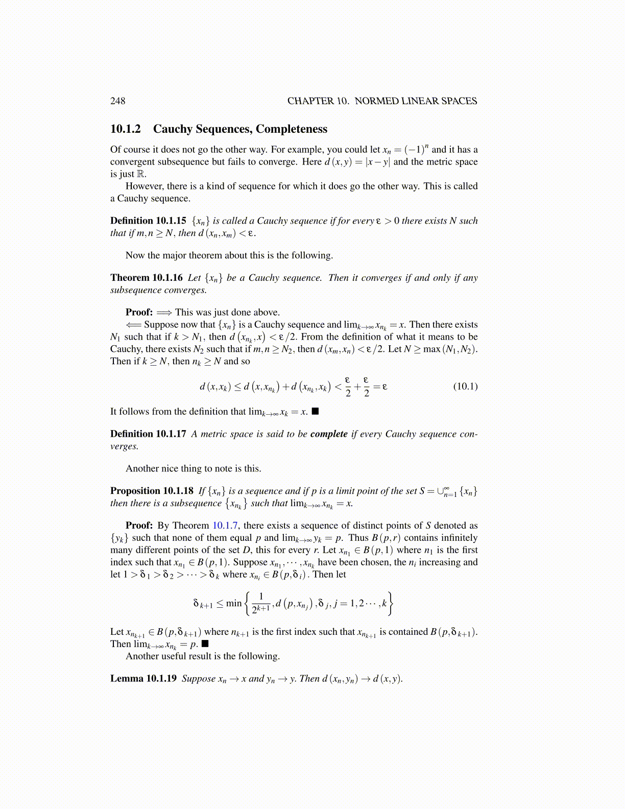 Theorem 10.1.16 Let {xn} be a Cauchy sequence. Then it converges if and only if anysubsequence converges.