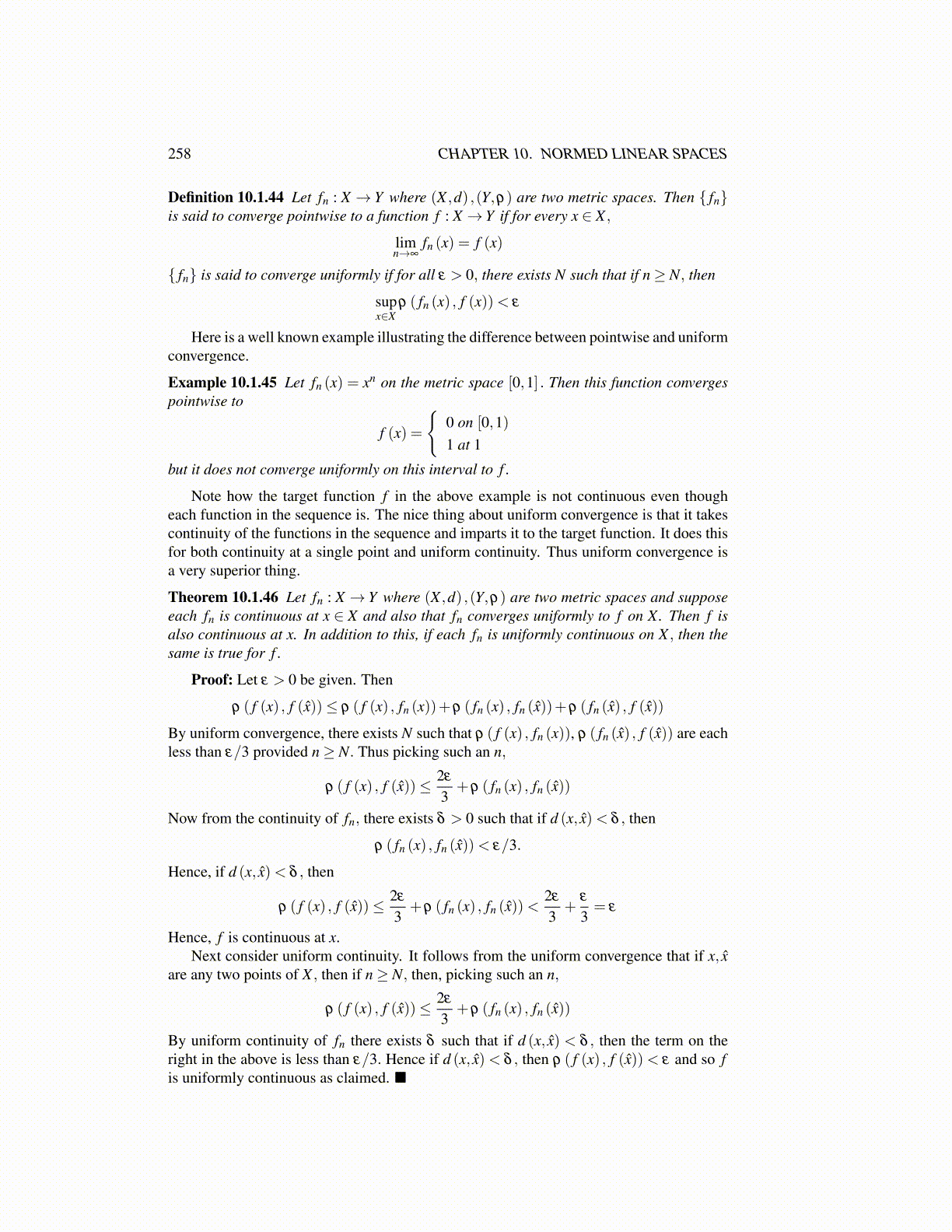 Definition 10.1.44 Let fn : X → Y where (X ,d) ,(Y,ρ) are two metric spaces. Then { fn}is said to converge pointwise to a function f : X → Y if for every x ∈ X ,