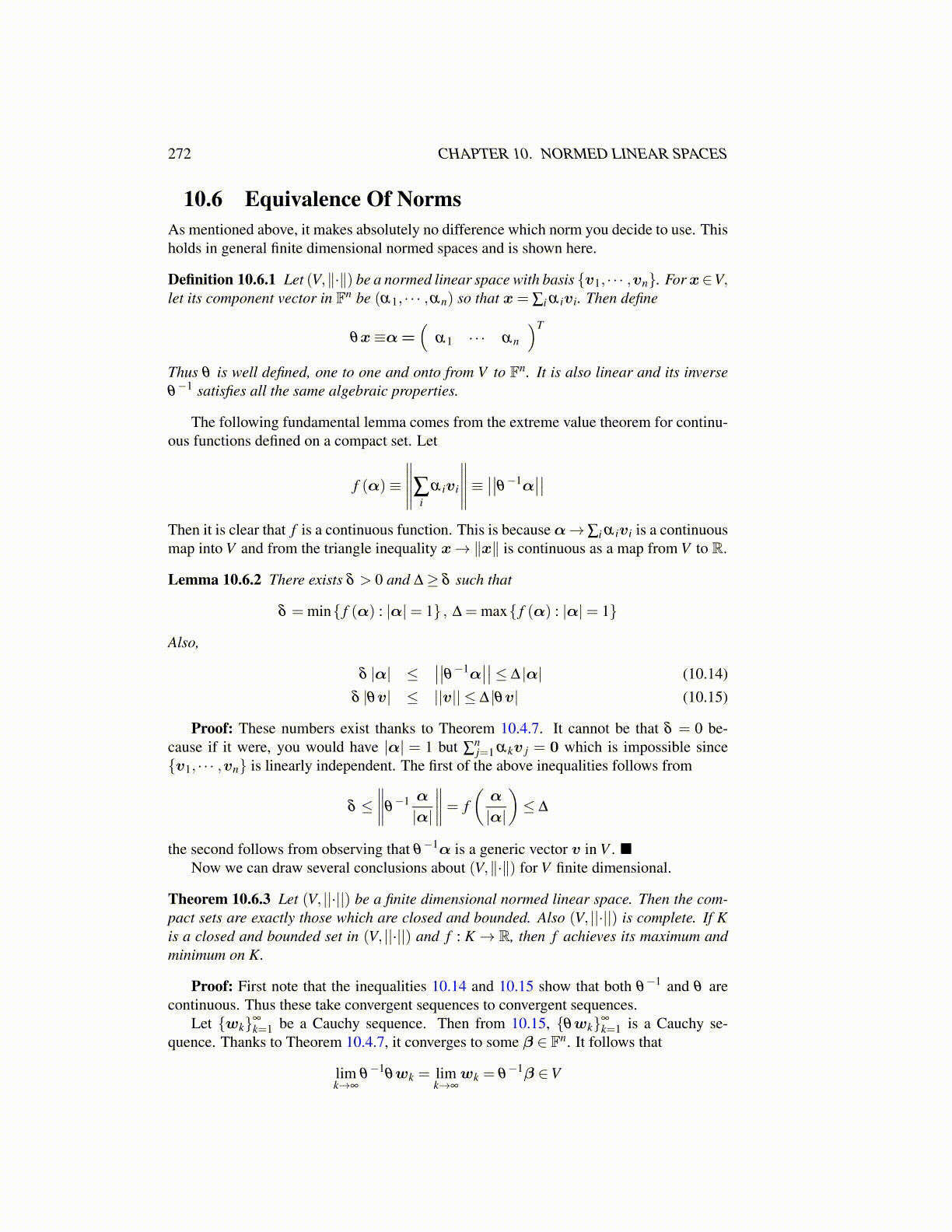 Theorem 10.6.3 Let (V, ||·||) be a finite dimensional normed linear space. Then the com-pact sets are exactly those which are closed and bounded. Also (V, ||·||) is complete. If Kis a closed and bounded set in (V, ||·||) and f : K → R, then f achieves its maximum andminimum on K.