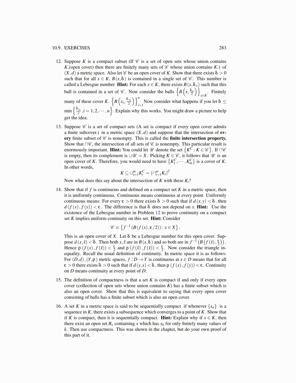 12. Suppose K is a compact subset (If C is a set of open sets whose union containsK,(open cover) then there are finitely many sets of C whose union contains K.) of(X ,d) a metric space. Also let C be an open cover of K. Show that there exists δ > 0such that for all x ∈ K, B(x,δ ) is contained in a single set of C . This number iscalled a Lebesgue number. Hint: For each x ∈ K, there exists B(x,δ x) such that thisball is contained in a set of C . Now consider the balls