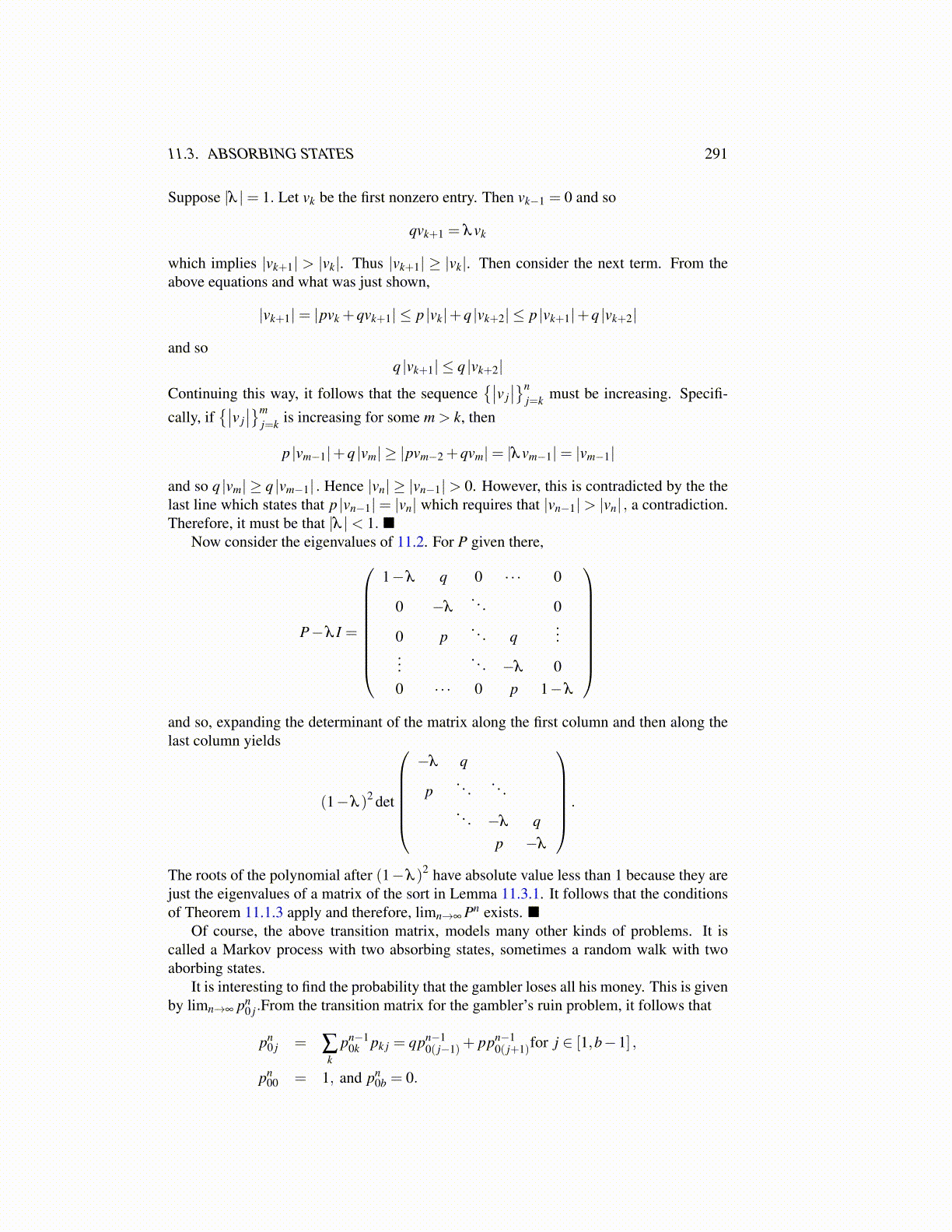 The roots of the polynomial after (1−λ )2 have absolute value less than 1 because they arejust the eigenvalues of a matrix of the sort in Lemma 11.3.1. It follows that the conditionsof Theorem 11.1.3 apply and therefore, limn→∞ Pn exists. ■