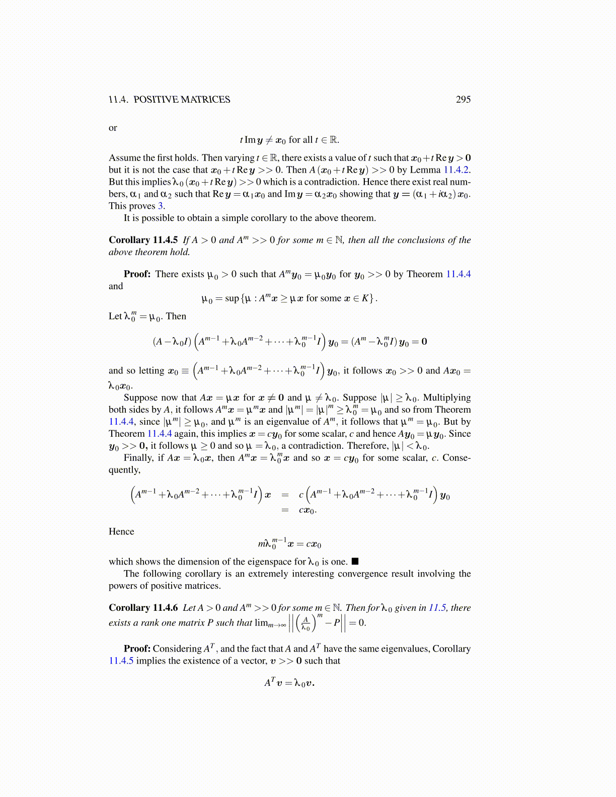 Assume the first holds. Then varying t ∈R, there exists a value of t such that x0+t Rey>0but it is not the case that x0 + t Rey >> 0. Then A(x0 + t Rey) >> 0 by Lemma 11.4.2.But this implies λ 0 (x0 + t Rey)>> 0 which is a contradiction. Hence there exist real num-bers, α1 and α2 such that Rey = α1x0 and Imy = α2x0 showing that y = (α1 + iα2)x0.This proves 3.