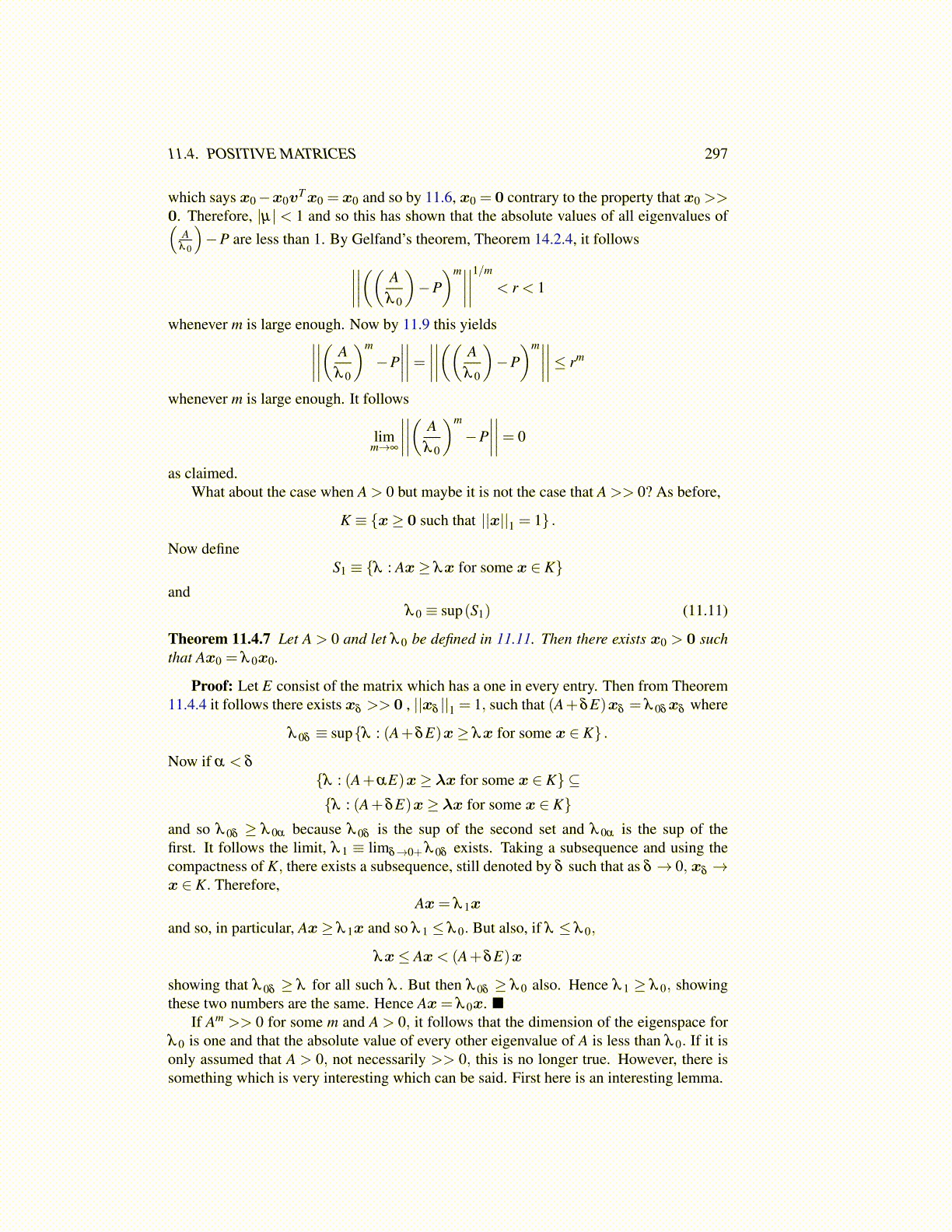 Theorem 11.4.7 Let A > 0 and let λ 0 be defined in 11.11. Then there exists x0 > 0 suchthat Ax0 = λ 0x0.