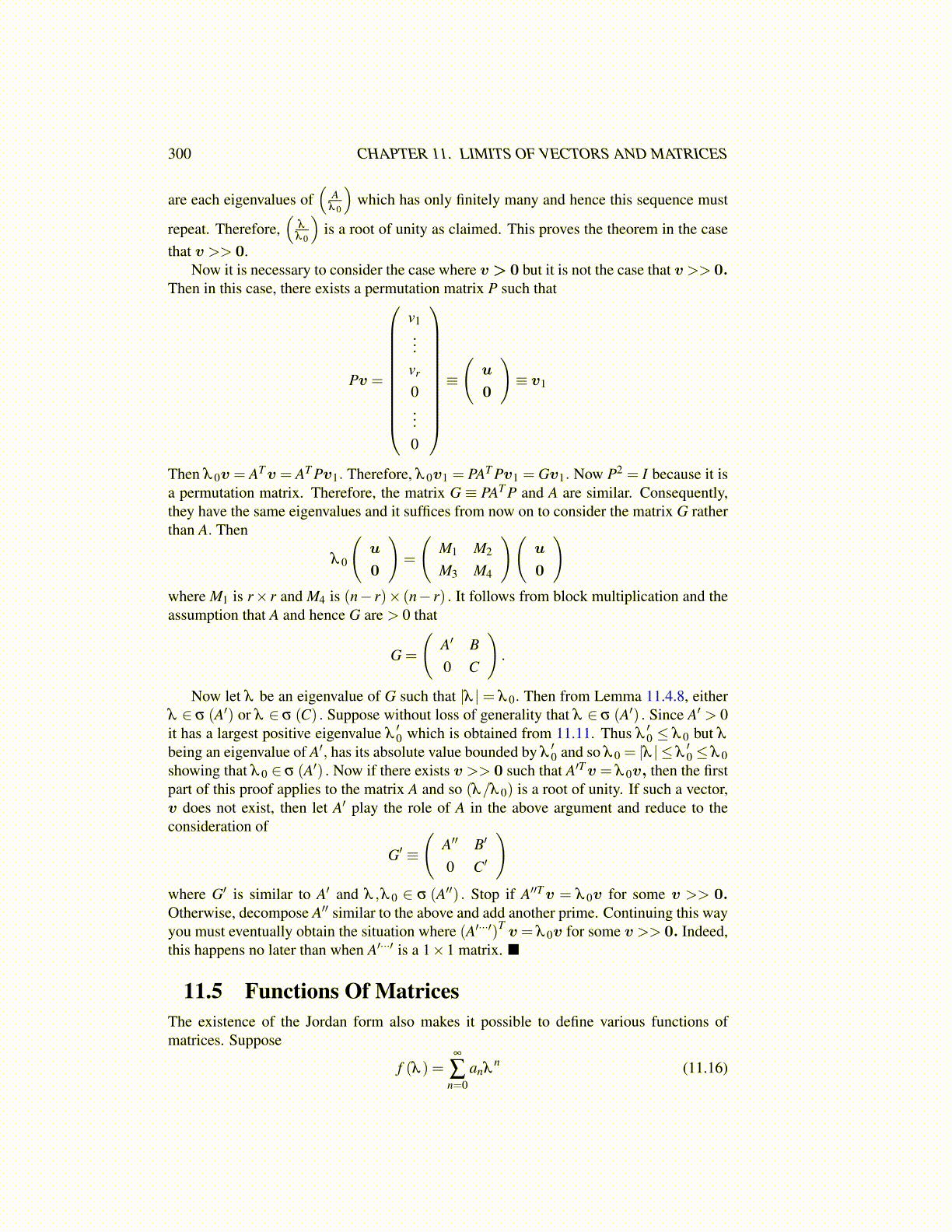 Now let λ be an eigenvalue of G such that |λ | = λ 0. Then from Lemma 11.4.8, eitherλ ∈ σ (A′) or λ ∈ σ (C) . Suppose without loss of generality that λ ∈ σ (A′) . Since A′ > 0it has a largest positive eigenvalue λ