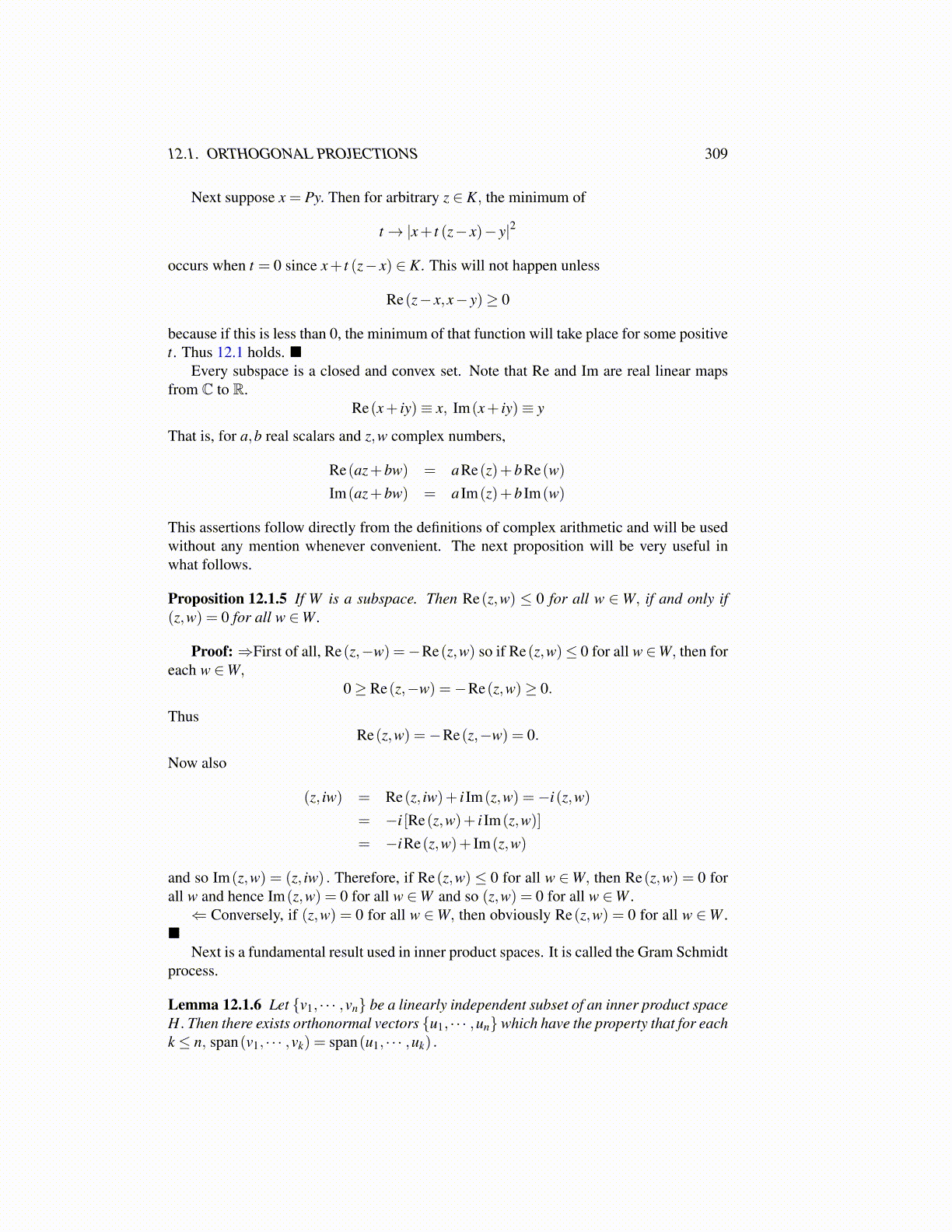 Lemma 12.1.6 Let {v1, · · · ,vn} be a linearly independent subset of an inner product spaceH. Then there exists orthonormal vectors {u1, · · · ,un}which have the property that for eachk ≤ n, span(v1, · · · ,vk) = span(u1, · · · ,uk) .