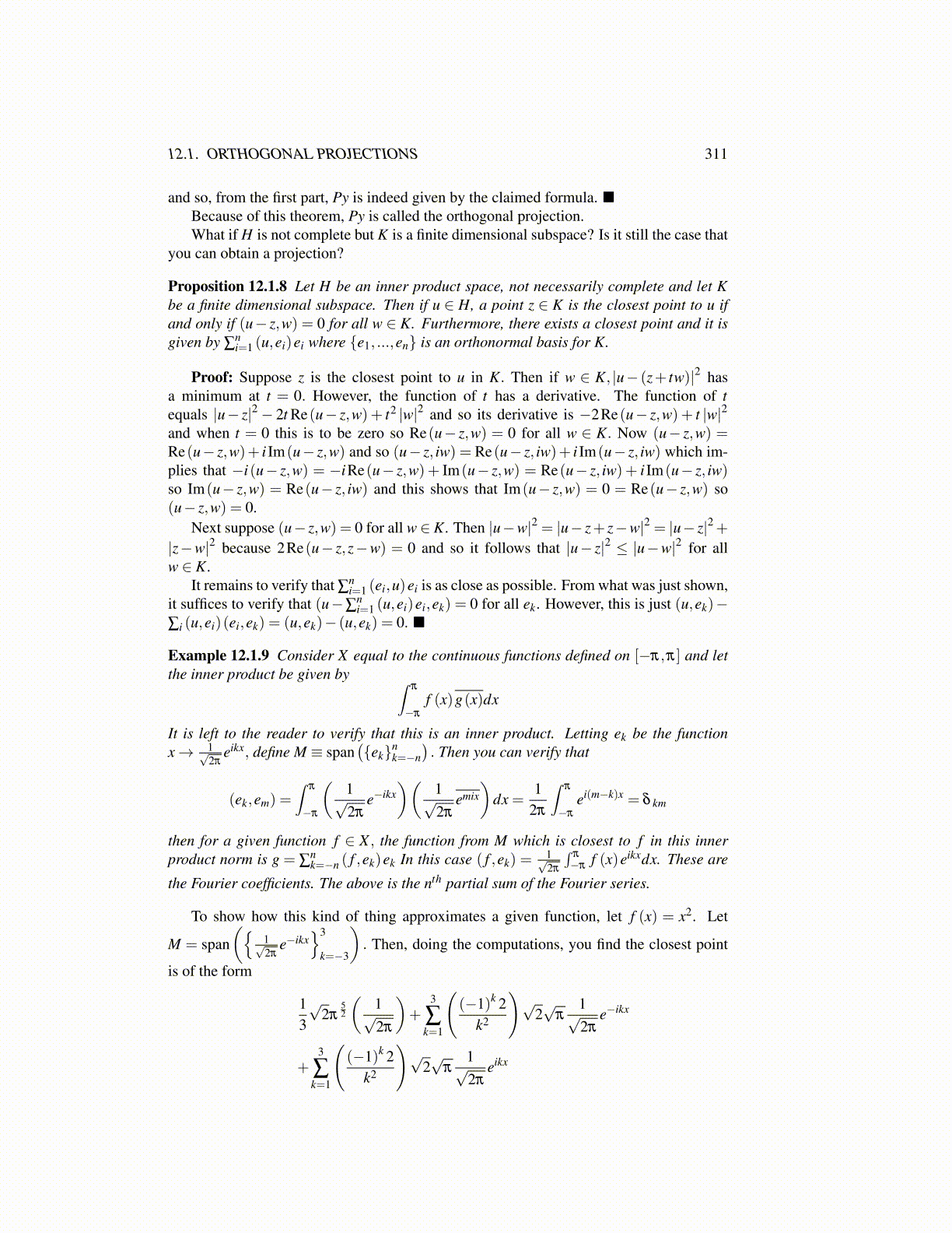 Proposition 12.1.8 Let H be an inner product space, not necessarily complete and let Kbe a finite dimensional subspace. Then if u ∈ H, a point z ∈ K is the closest point to u ifand only if (u− z,w) = 0 for all w ∈ K. Furthermore, there exists a closest point and it isgiven by ∑