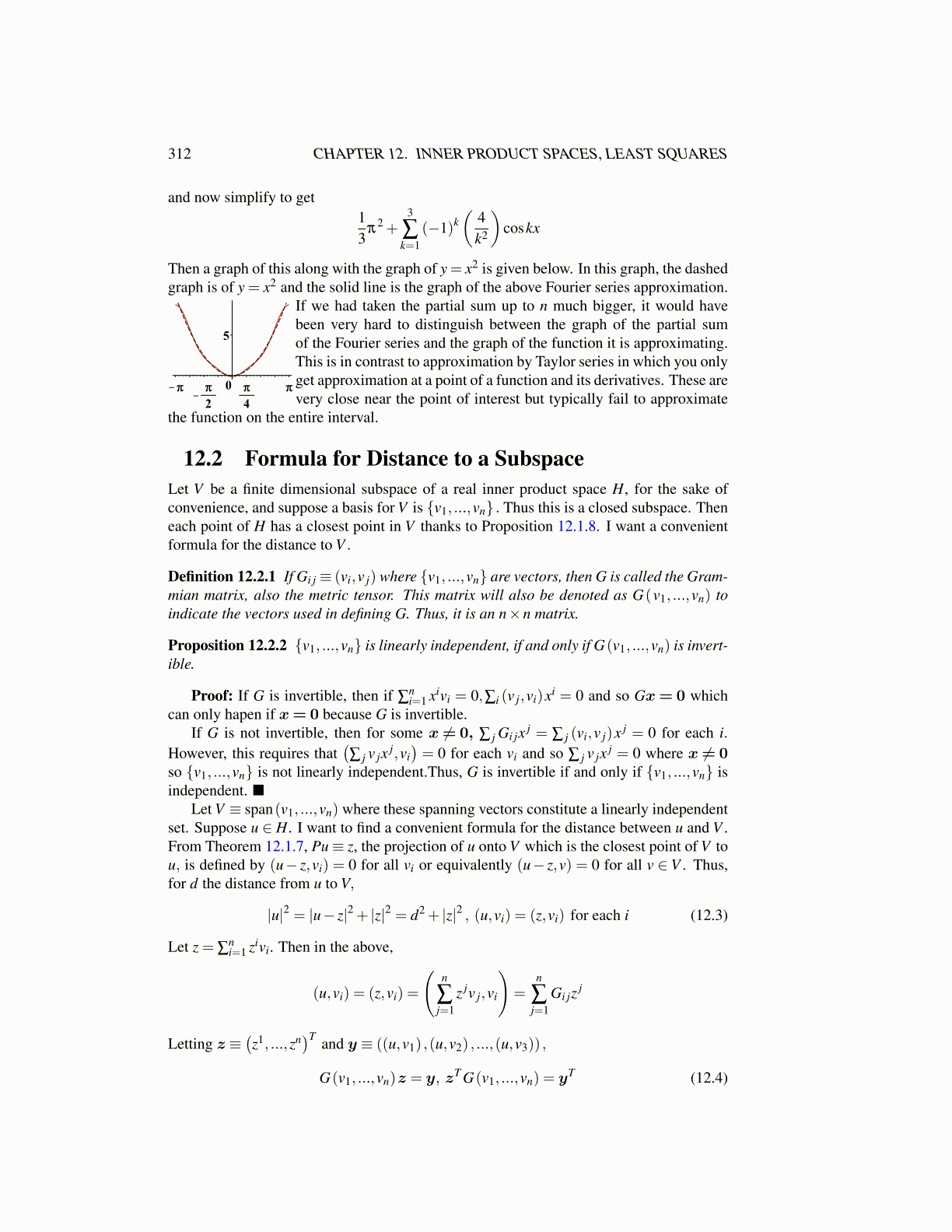 12.2 Formula for Distance to a SubspaceLet V be a finite dimensional subspace of a real inner product space H, for the sake ofconvenience, and suppose a basis for V is {v1, ...,vn} . Thus this is a closed subspace. Theneach point of H has a closest point in V thanks to Proposition 12.1.8. I want a convenientformula for the distance to V .