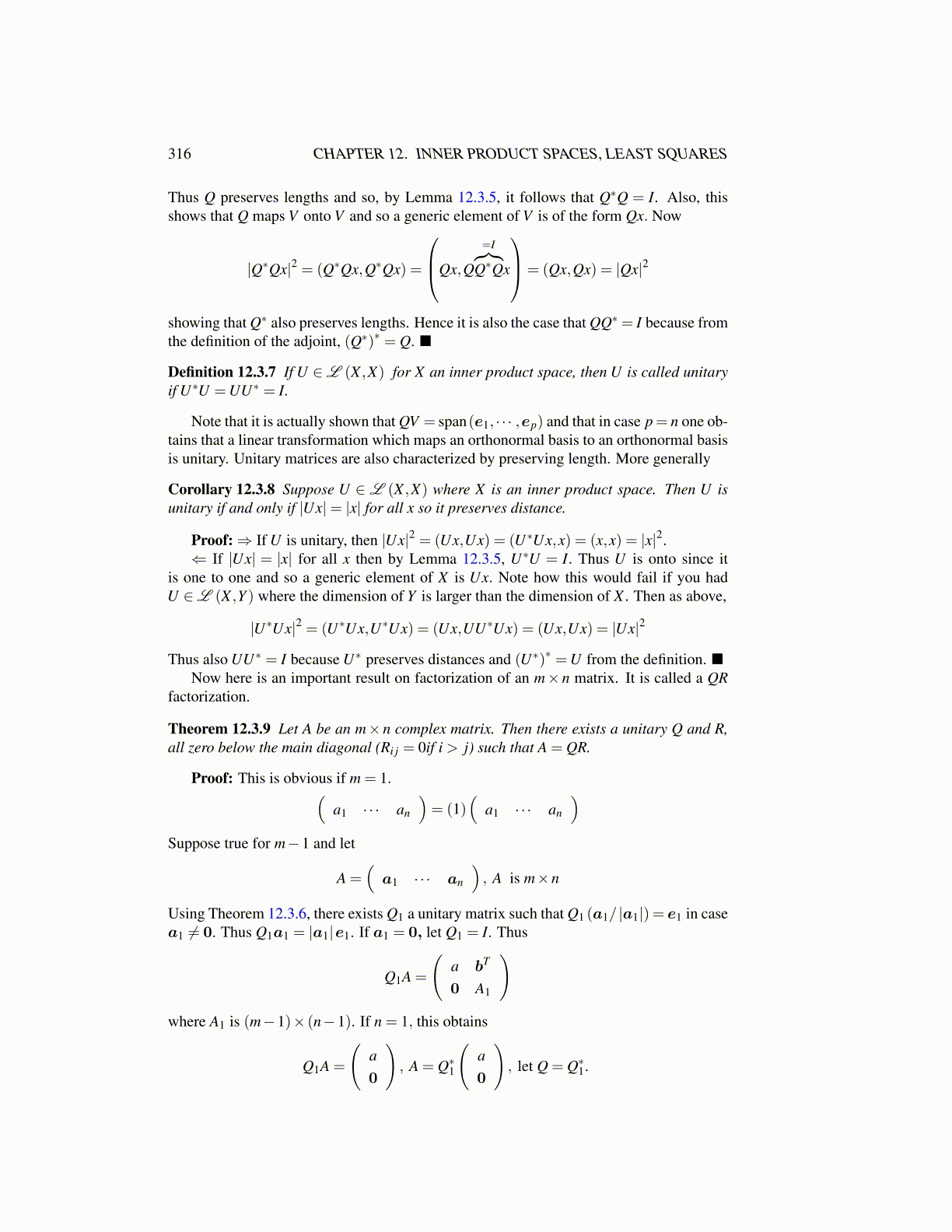 Corollary 12.3.8 Suppose U ∈ L (X ,X) where X is an inner product space. Then U isunitary if and only if |Ux|= |x| for all x so it preserves distance.