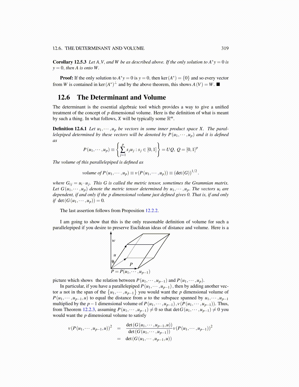 12.6 The Determinant and VolumeThe determinant is the essential algebraic tool which provides a way to give a unifiedtreatment of the concept of p dimensional volume. Here is the definition of what is meantby such a thing. In what follows, X will be typically some Rm.