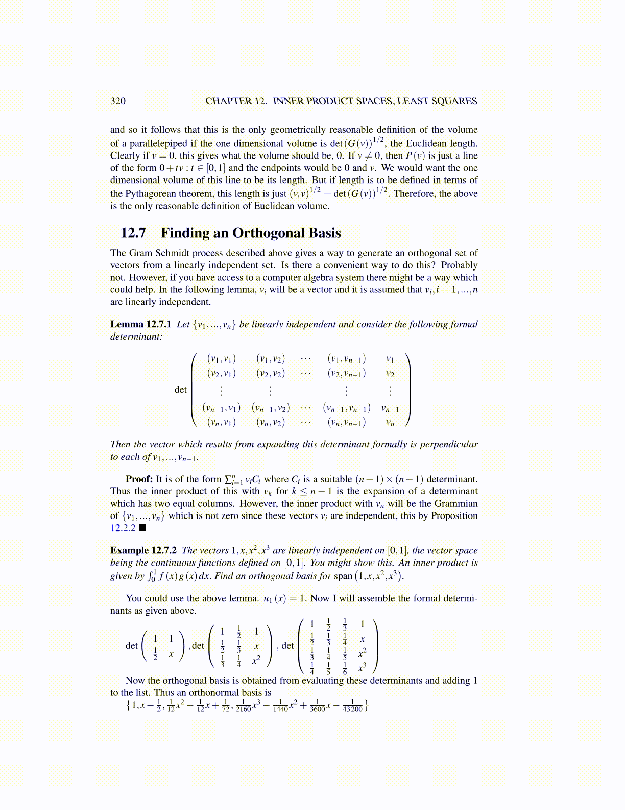 12.7 Finding an Orthogonal BasisThe Gram Schmidt process described above gives a way to generate an orthogonal set ofvectors from a linearly independent set. Is there a convenient way to do this? Probablynot. However, if you have access to a computer algebra system there might be a way whichcould help. In the following lemma, vi will be a vector and it is assumed that vi, i = 1, ...,nare linearly independent.