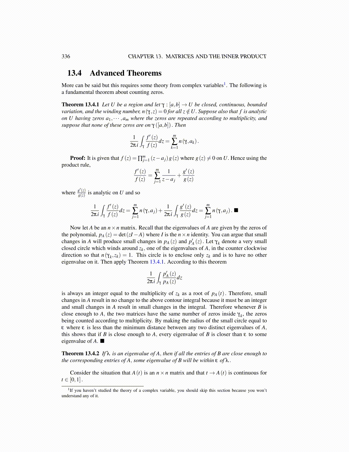 Now let A be an n×n matrix. Recall that the eigenvalues of A are given by the zeros ofthe polynomial, pA (z) = det(zI−A) where I is the n×n identity. You can argue that smallchanges in A will produce small changes in pA (z) and p′A (z) . Let γk denote a very smallclosed circle which winds around zk, one of the eigenvalues of A, in the counter clockwisedirection so that n(γk,zk) = 1. This circle is to enclose only zk and is to have no othereigenvalue on it. Then apply Theorem 13.4.1. According to this theorem