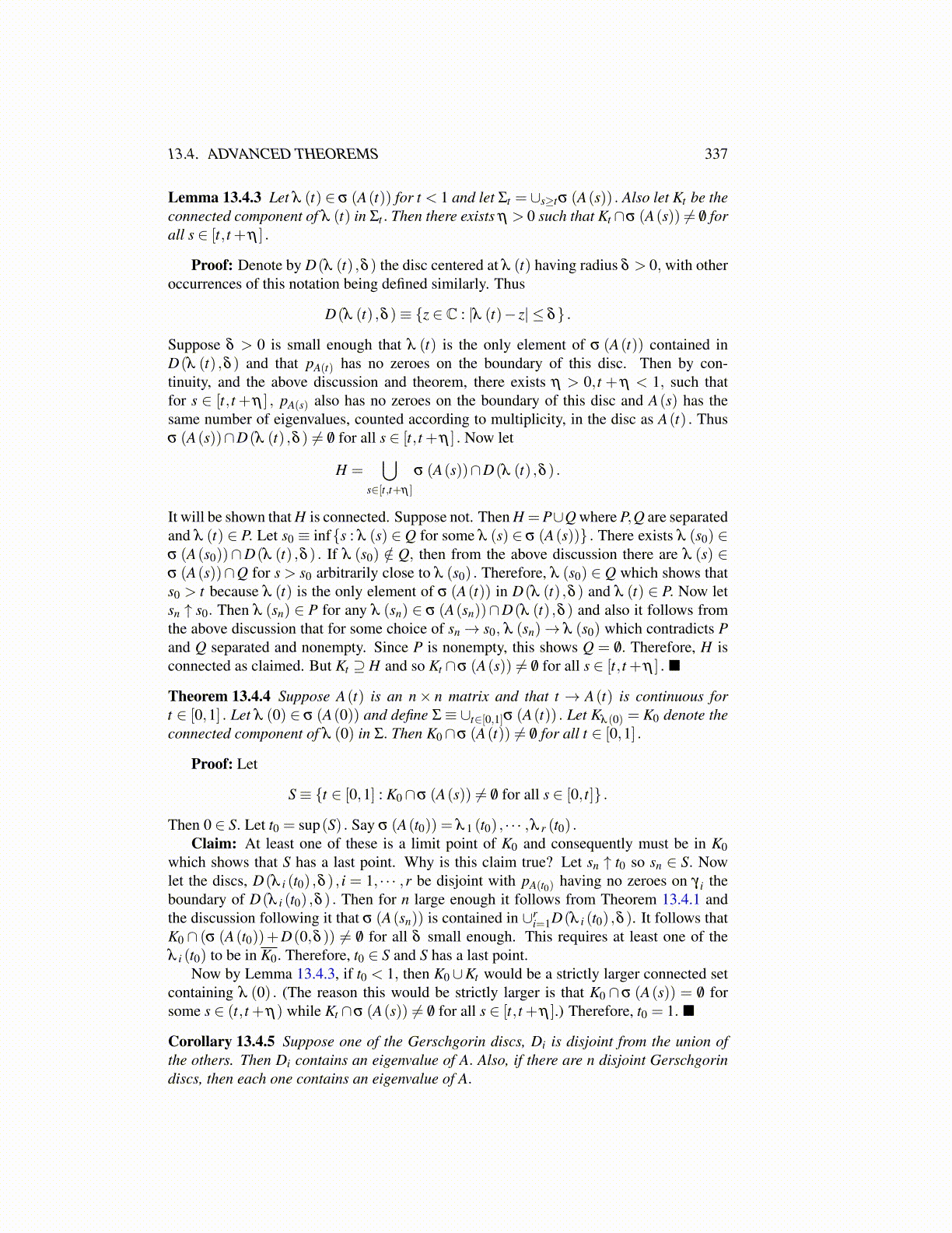 Theorem 13.4.4 Suppose A(t) is an n× n matrix and that t → A(t) is continuous fort ∈ [0,1] . Let λ (0) ∈ σ (A(0)) and define Σ≡ ∪t∈[0,1]σ (A(t)) . Let Kλ (0) = K0 denote theconnected component of λ (0) in Σ. Then K0∩σ (A(t)) ̸= /0 for all t ∈ [0,1] .