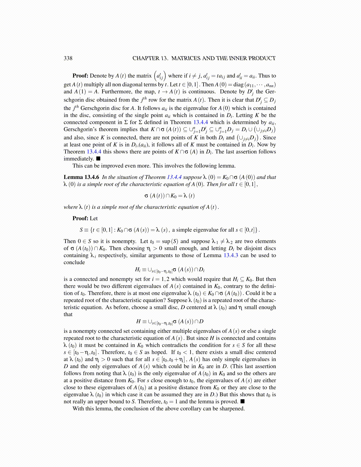 the jth Gerschgorin disc for A. It follows aii is the eigenvalue for A(0) which is containedin the disc, consisting of the single point aii which is contained in Di. Letting K be theconnected component in Σ for Σ defined in Theorem 13.4.4 which is determined by aii,Gerschgorin’s theorem implies that K ∩ σ (A(t)) ⊆ ∪n
