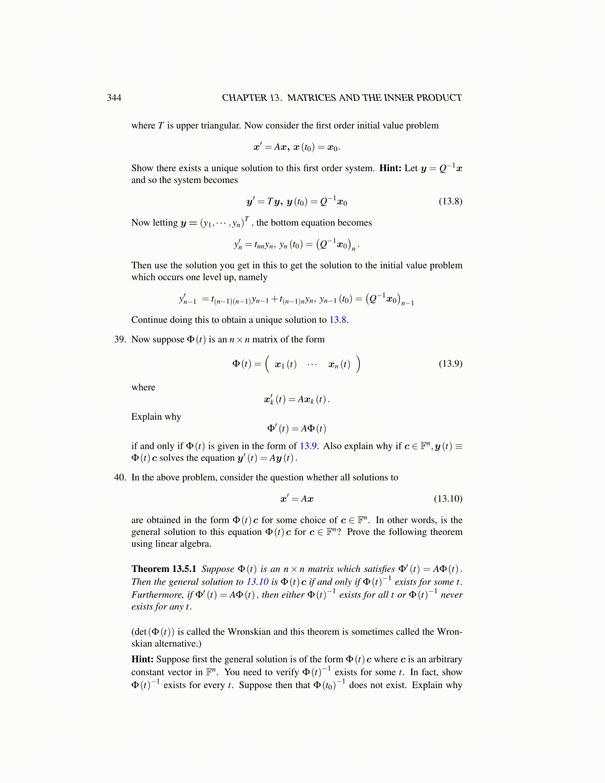 if and only if Φ(t) is given in the form of 13.9. Also explain why if c ∈ Fn,y (t) ≡Φ(t)c solves the equation y′ (t) = Ay (t) .