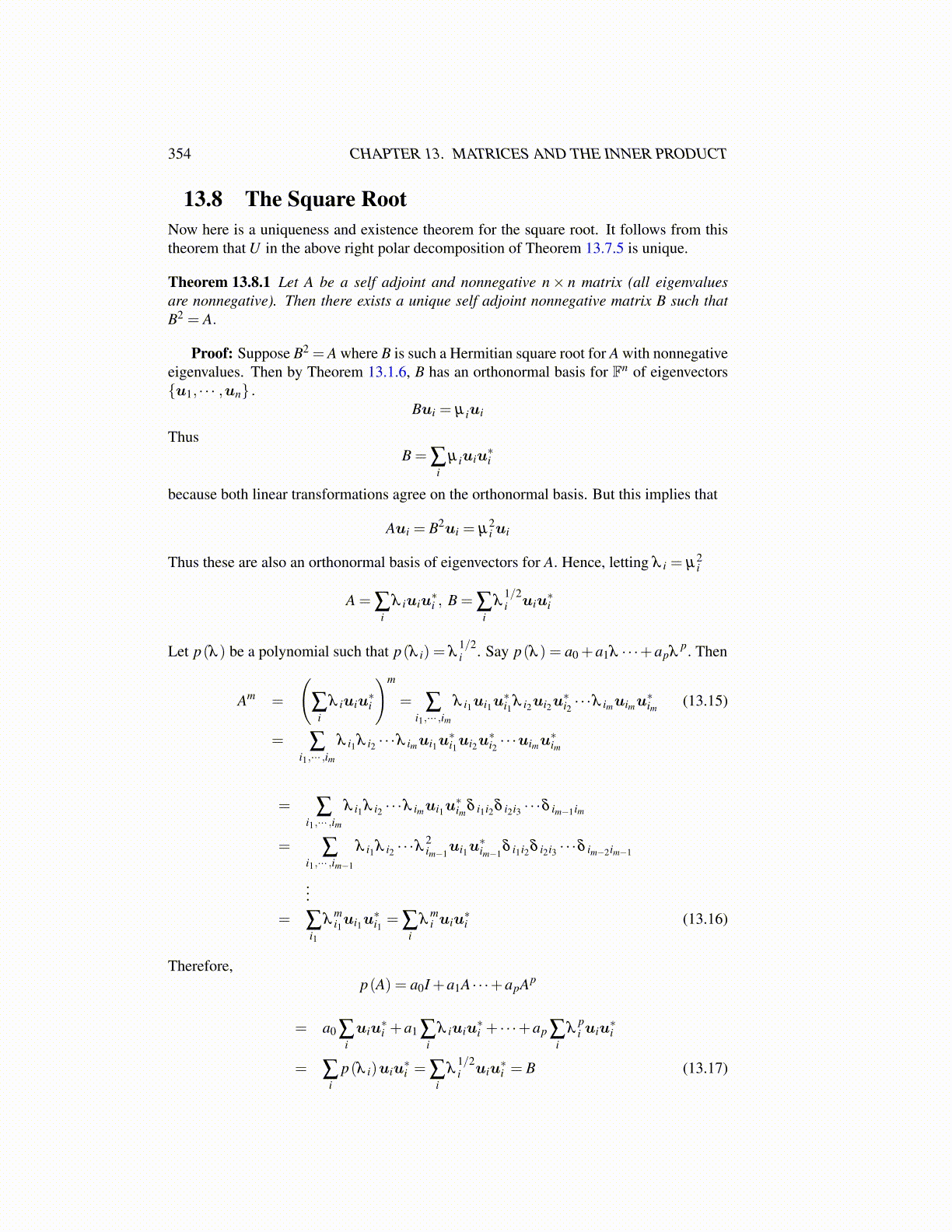 Theorem 13.8.1 Let A be a self adjoint and nonnegative n× n matrix (all eigenvaluesare nonnegative). Then there exists a unique self adjoint nonnegative matrix B such thatB2 = A.