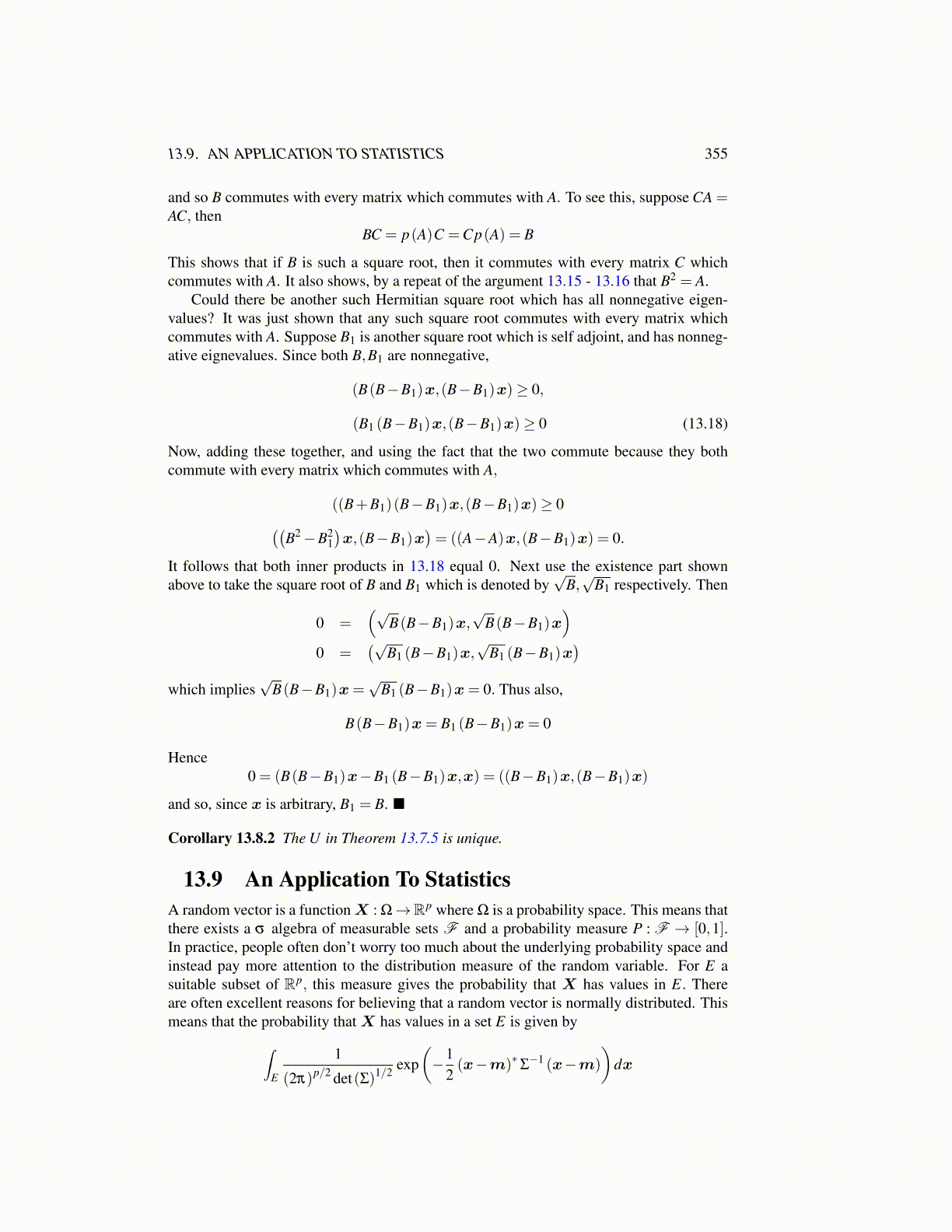 This shows that if B is such a square root, then it commutes with every matrix C whichcommutes with A. It also shows, by a repeat of the argument 13.15 - 13.16 that B2 = A.