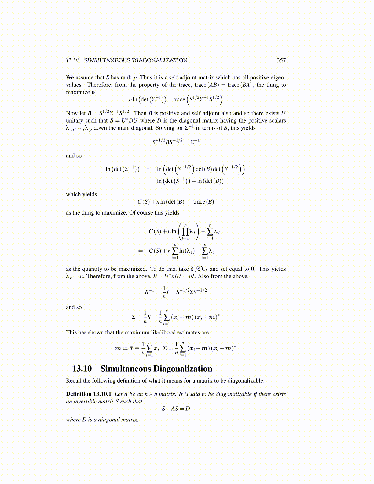 )Now let B = S1/2Σ−1S1/2. Then B is positive and self adjoint also and so there exists Uunitary such that B = U∗DU where D is the diagonal matrix having the positive scalarsλ 1, · · · ,λ p down the main diagonal. Solving for Σ−1 in terms of B, this yields
