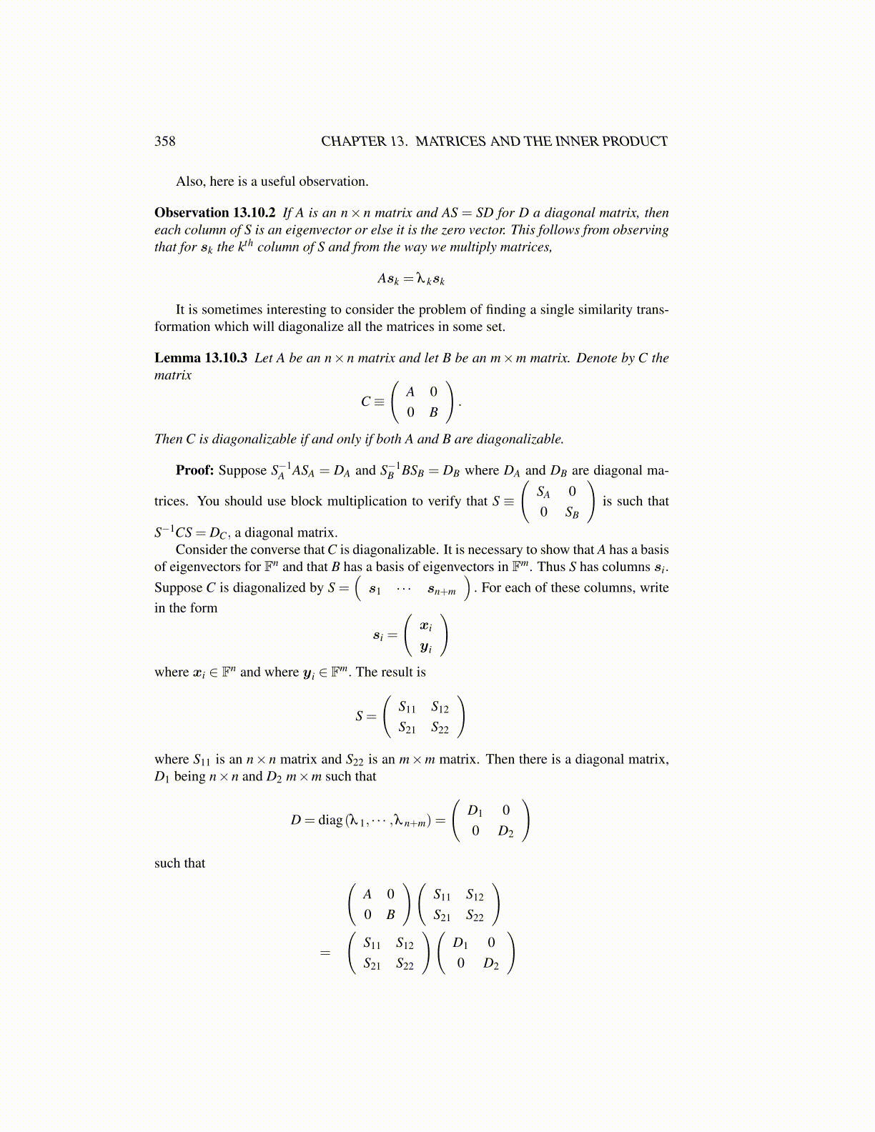 Observation 13.10.2 If A is an n× n matrix and AS = SD for D a diagonal matrix, theneach column of S is an eigenvector or else it is the zero vector. This follows from observingthat for sk the kth column of S and from the way we multiply matrices,