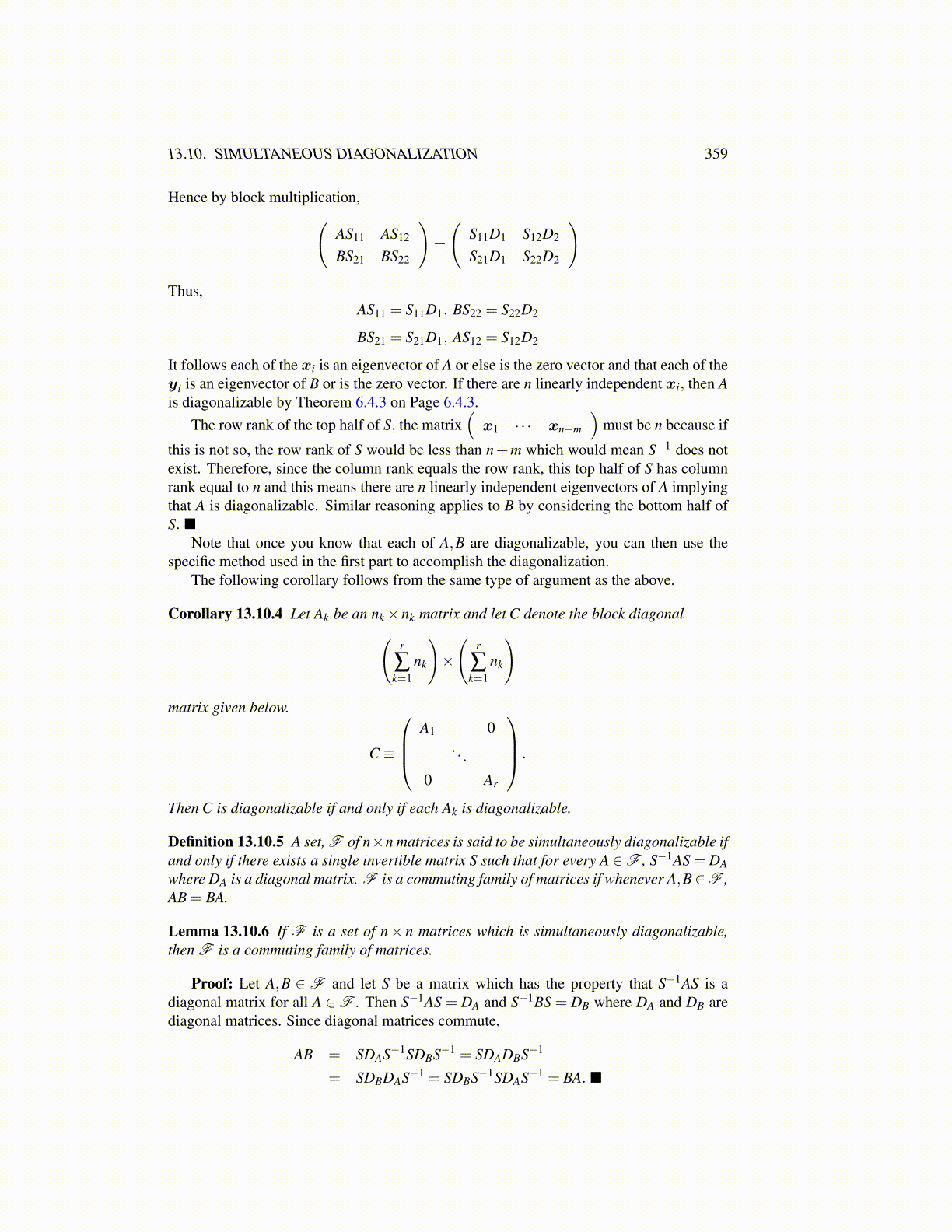 Definition 13.10.5 A set, F of n×n matrices is said to be simultaneously diagonalizable ifand only if there exists a single invertible matrix S such that for every A ∈F , S−1AS = DAwhere DA is a diagonal matrix. F is a commuting family of matrices if whenever A,B∈F ,AB = BA.