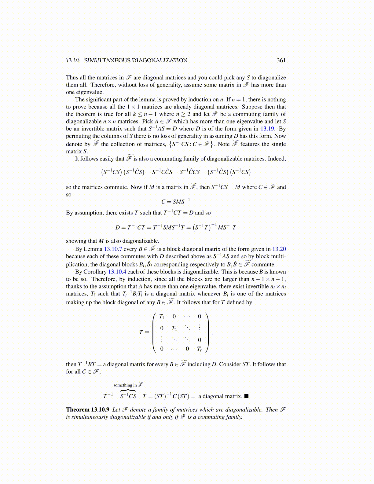 13.10. SIMULTANEOUS DIAGONALIZATION 361Thus all the matrices in Y are diagonal matrices and you could pick any S to diagonalizethem all. Therefore, without loss of generality, assume some matrix in .Y has more thanone eigenvalue.The significant part of the lemma is proved by induction on n. If n = 1, there is nothingto prove because all the | x 1 matrices are already diagonal matrices. Suppose then thatthe theorem is true for all kK <n—1 where n > 2 and let Y be a commuting family ofdiagonalizable n x n matrices. Pick A € Y which has more than one eigenvalue and let Sbe an invertible matrix such that S~!AS = D where D is of the form given in 13.19. Bypermuting the columns of S there is no loss of generality in assuming D has this form. Nowdenote by ¥ the collection of matrices, {S~'CS:C € #}. Note F features the singlematrix S. _It follows easily that F is also a commuting family of diagonalizable matrices. Indeed,(s-'cs) (S~'€s) =s~'c€s = S~'CCS = (S~'ES) (S'CS)so the matrices commute. Now if M is a matrix in &, then S-'CS = M where C € ¥ andsoC=SMs"!By assumption, there exists T such that T~'CT = D and so-1 -1 -1 —Ip\—l yp o-D=T"'CT =T'SMS"'T = (S"'T) MS"'Tshowing that M is also diagonalizable.By Lemma 13.10.7 every B € ¥ is a block diagonal matrix of the form given in 13.20because each of these commutes with D described above as S~'AS and so by block multi-plication, the diagonal blocks B;,B; corresponding respectively to B,B € F commute.By Corollary 13.10.4 each of these blocks is diagonalizable. This is because B is knownto be so. Therefore, by induction, since all the blocks are no larger than n—1 xn—1,thanks to the assumption that A has more than one eigenvalue, there exist invertible n; x nj;matrices, 7; such that T,'BiT; is a diagonal matrix whenever B; is one of the matricesmaking up the block diagonal of any B € F \t follows that for T defined byT O -+ 00 TF.T= ;00 0 T,;then T7~'BT =a diagonal matrix for every B € F including D. Consider ST. It follows thatfor all C € F,something in F1T | s-'!cCS T=(ST)~'C(ST) = adiagonal matrix.Theorem 13.10.9 Let ¥ denote a family of matrices which are diagonalizable. Then Fis simultaneously diagonalizable if and only if F is a commuting family.
